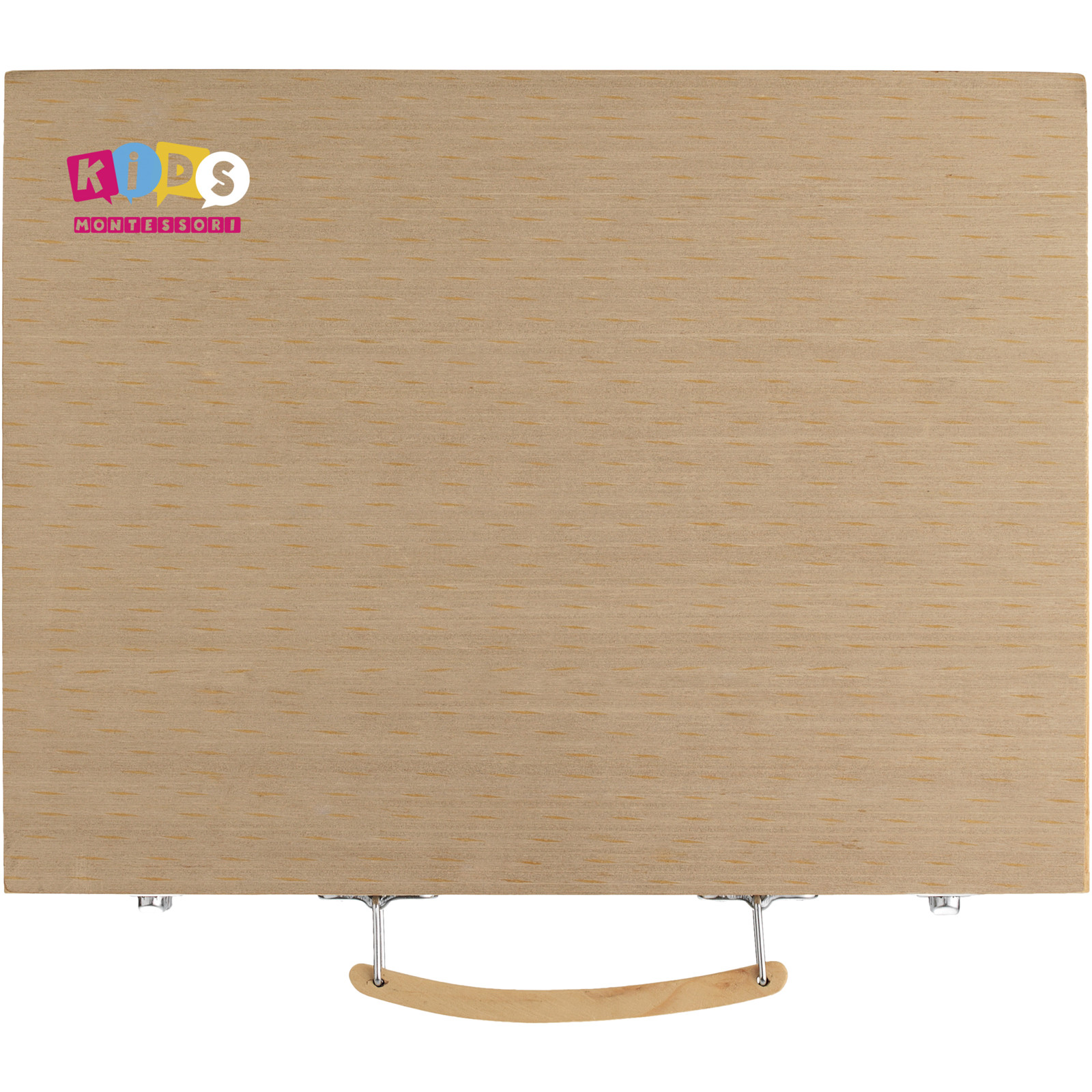 Set aus 12 Wassermalfarben, 12 Farbstiften, 12 Malstiften, 12 Öl Pastellfarben, 12 Malkreiden, Paletten, Kleber, Radierer, Spitzer, HB Bleistift und Pinsel in einem Holzkasten.
