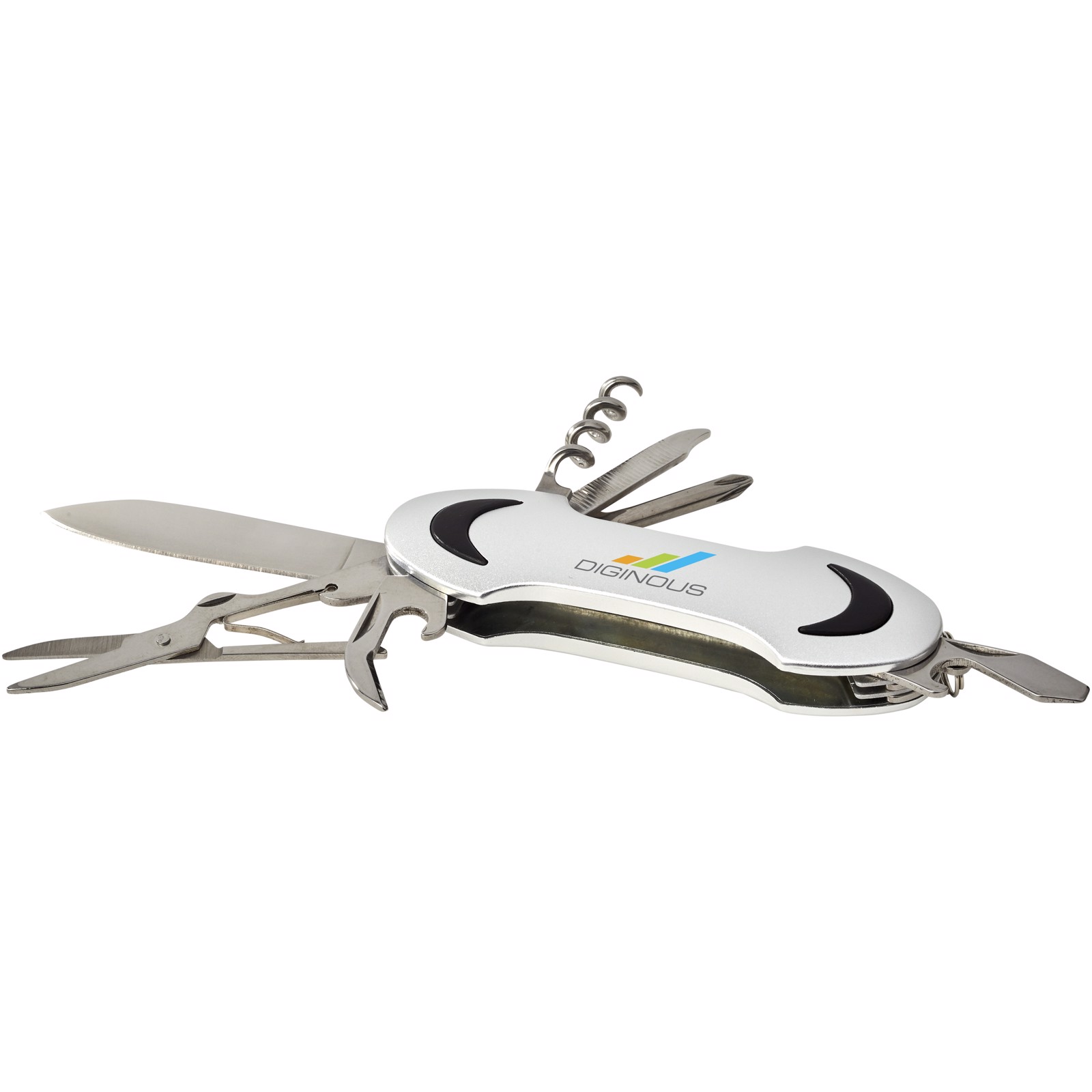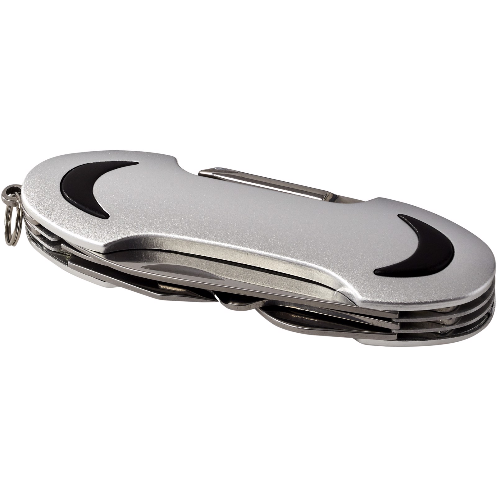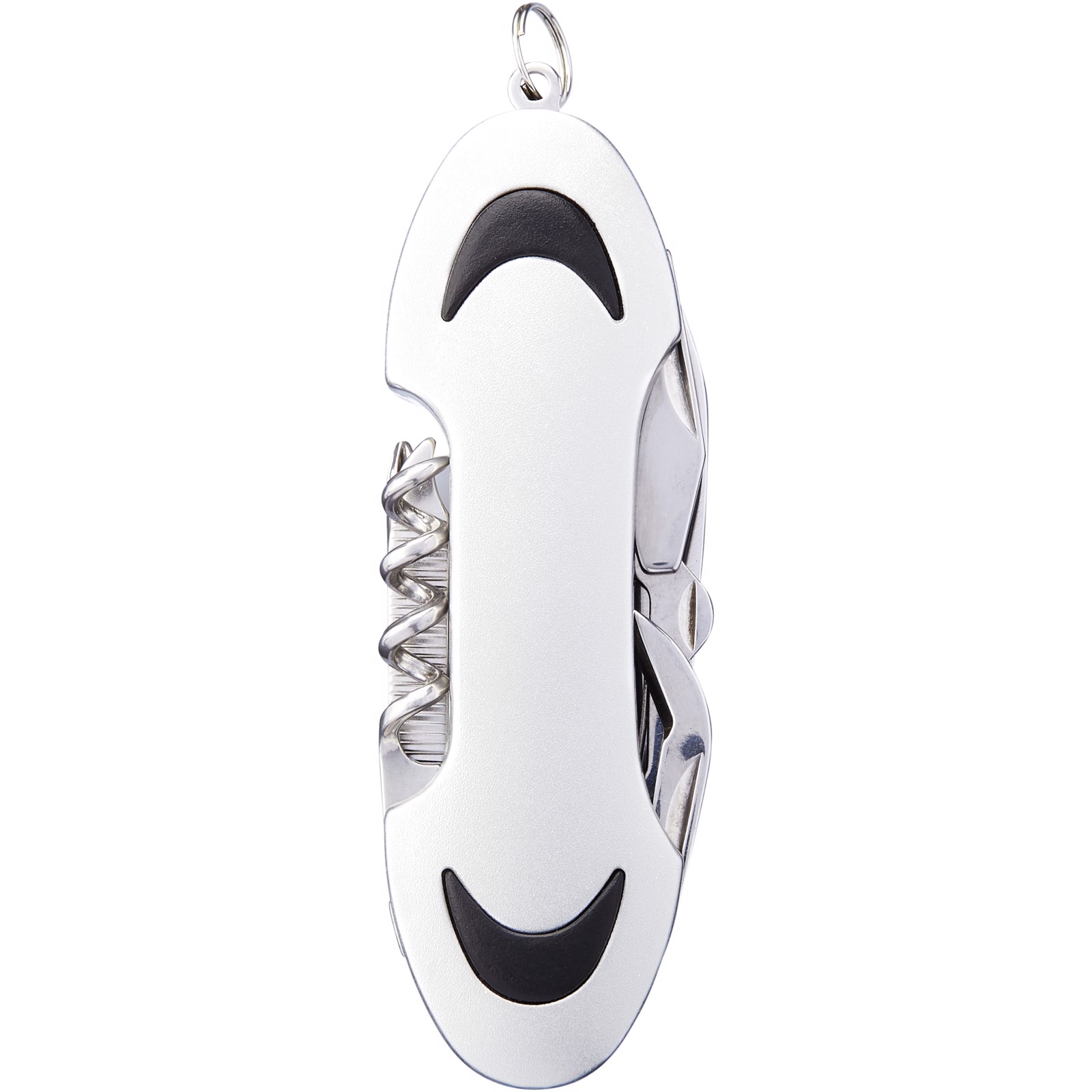 Taschenmesser mit Klinge, Schere, Korkenzieher, Flaschenöffner, Kreuzschlitzschraubendreher, Nagelfeile, Kapselheber mit Kastenöffner und Flachschraubendreher. Inklusive Mini-Schlüsselring.