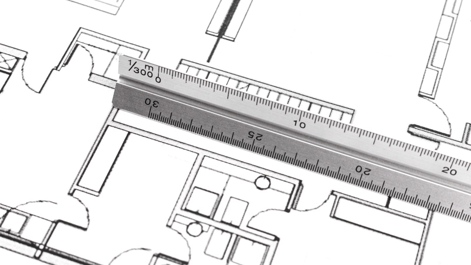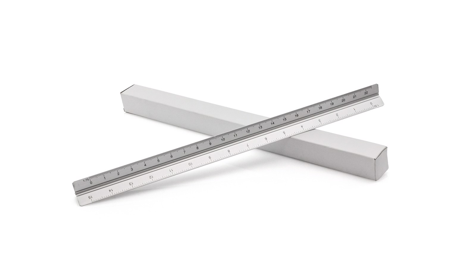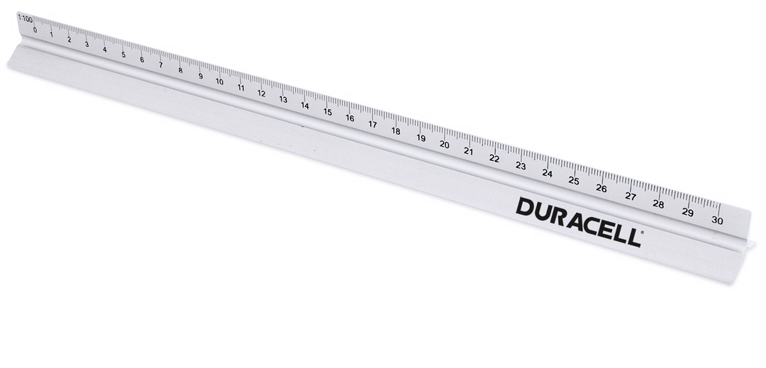 30cm triangular design aluminum scale meter. Scales 1:20/1:25/1:50/1:75/1:100. Smooth face for printing. Presented in an individual box. 30 cm. Scales: 1:20, 1:25, 1:50, 1:75, 1:100