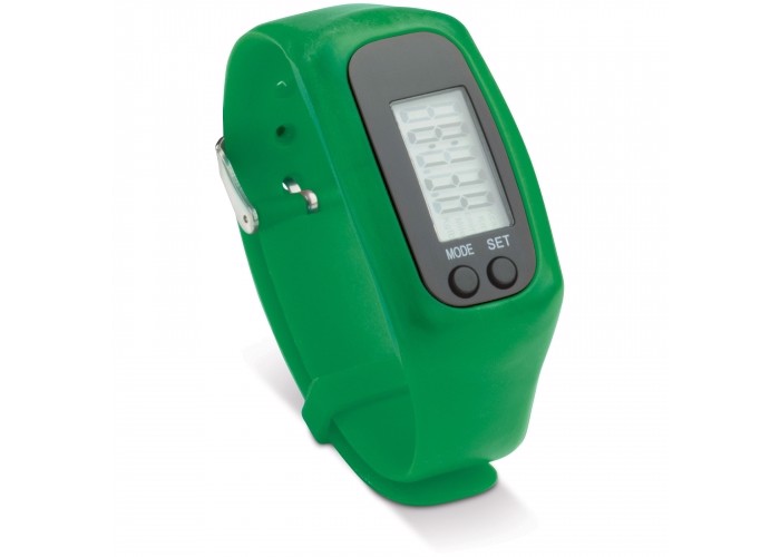 Schrittzähler mit vier Funktionen: Zeit, Schritte, Abstand und Kalorien werden auf diesem eleganten Modell angegeben. Bei der Messung der Schritte müssen die Arme hin und her bewegt werden, um das Messinstrument in der Uhr zu aktivieren.