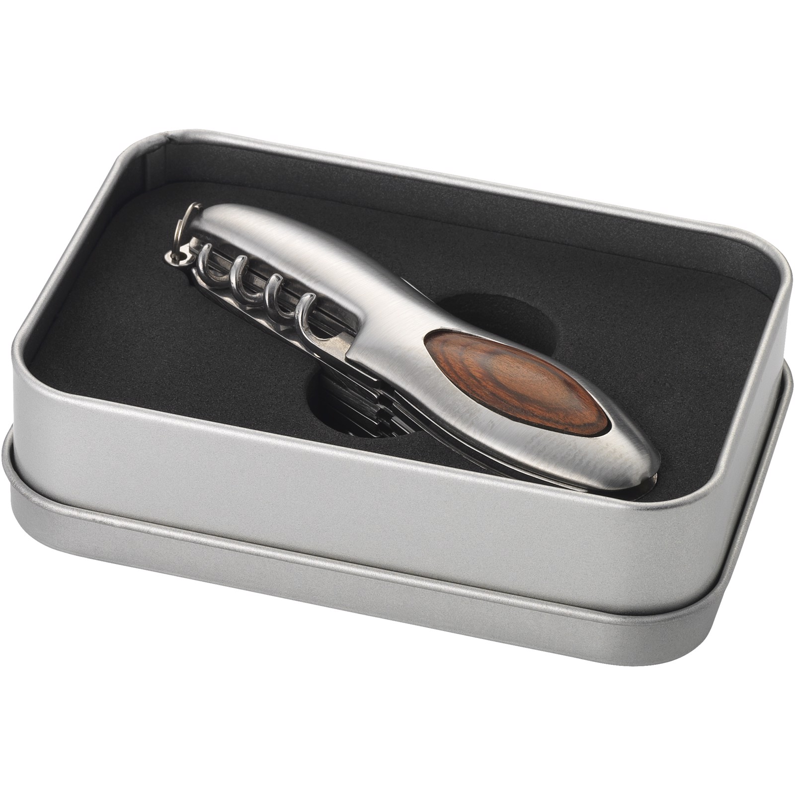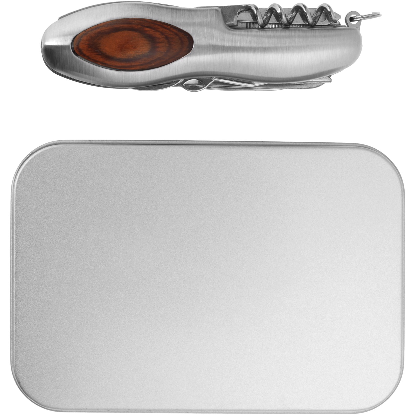 15 teiliges Taschenmesser mit Holzapplikation. Mit Geschenkkasten aus Metall.