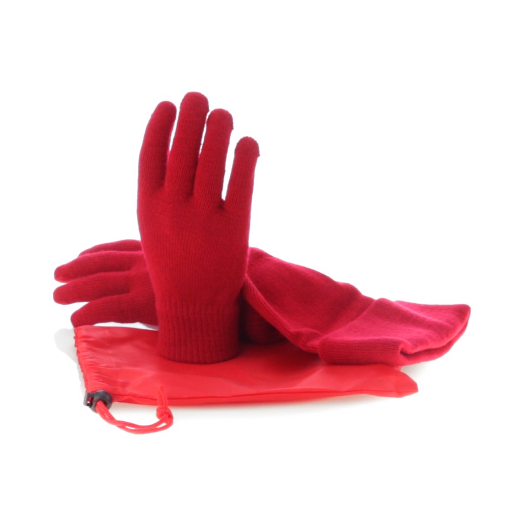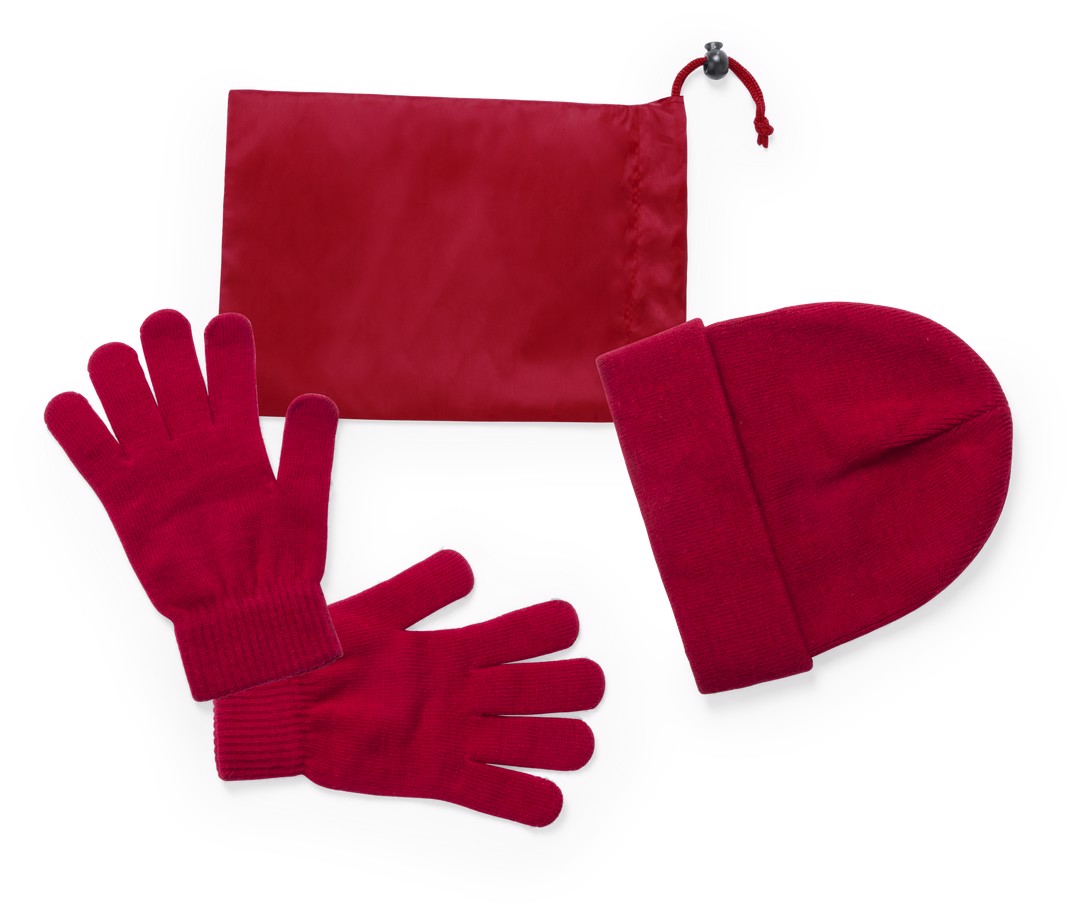 Winter set of vivid colors in soft and warm material in combination of polyester and acrylic. Includes pair of gloves and cap with matching color tab. Presented in a matching color polyester case with drawstring closure and adjustment accessory. One Size. Adult