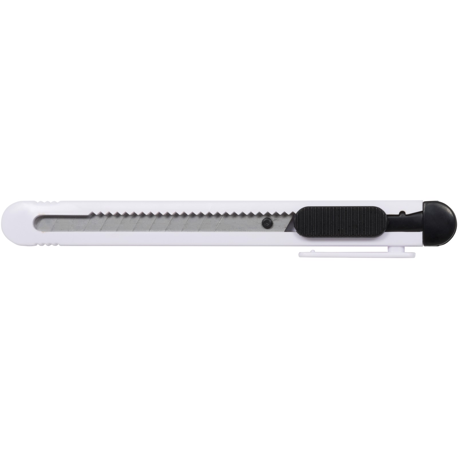 Universalmesser mit einziehbarer und austauschbarer Klinge (80 x 9 mm) mit 12 Segmenten. Integriertes Klingenabbrechwerkzeug und Taschenclip.