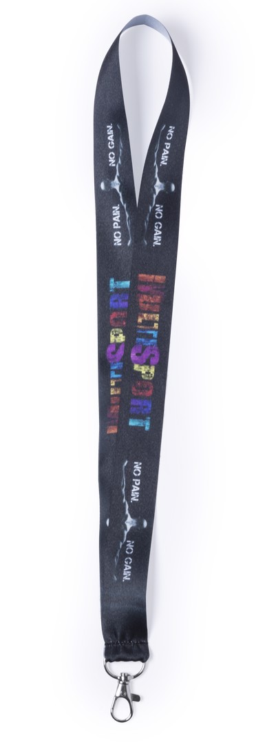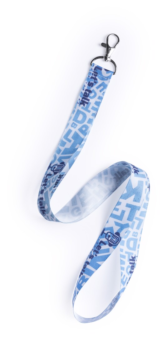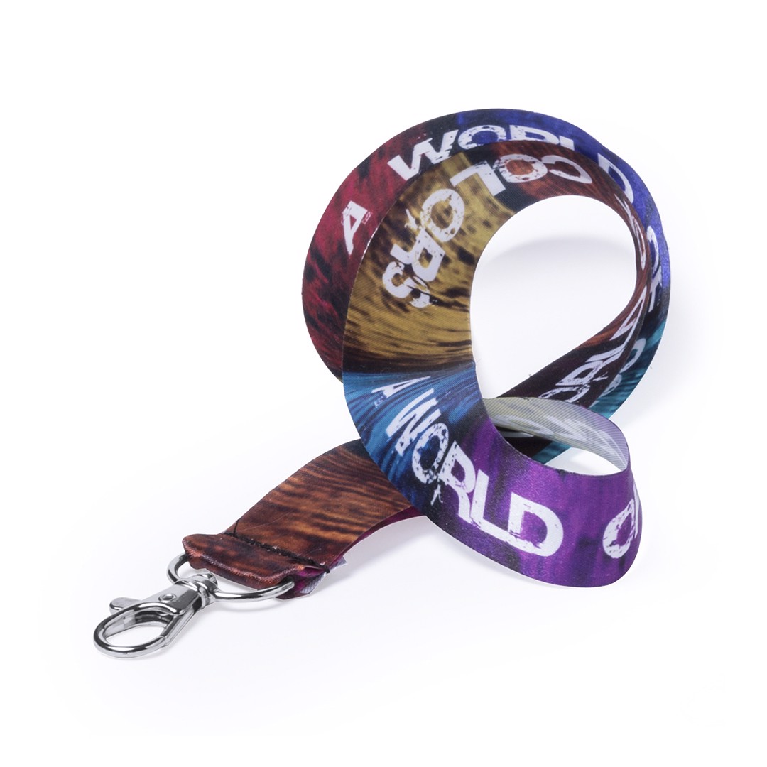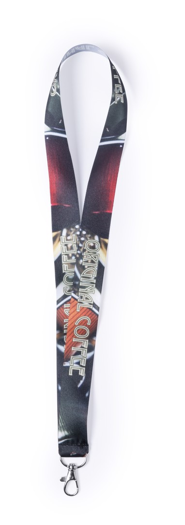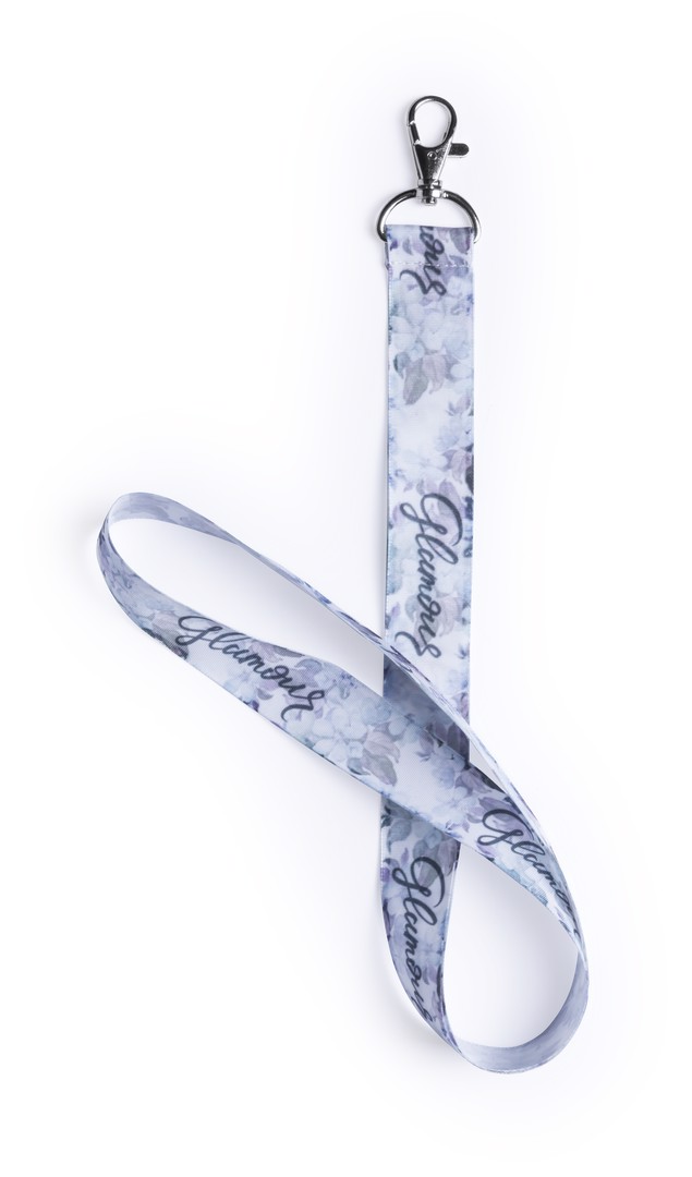 Lanyard with special wide strips in resistant and soft polyester with metallic carabiner accessory. Especially designed for total customization in sublimation. Orders from 250 pieces.