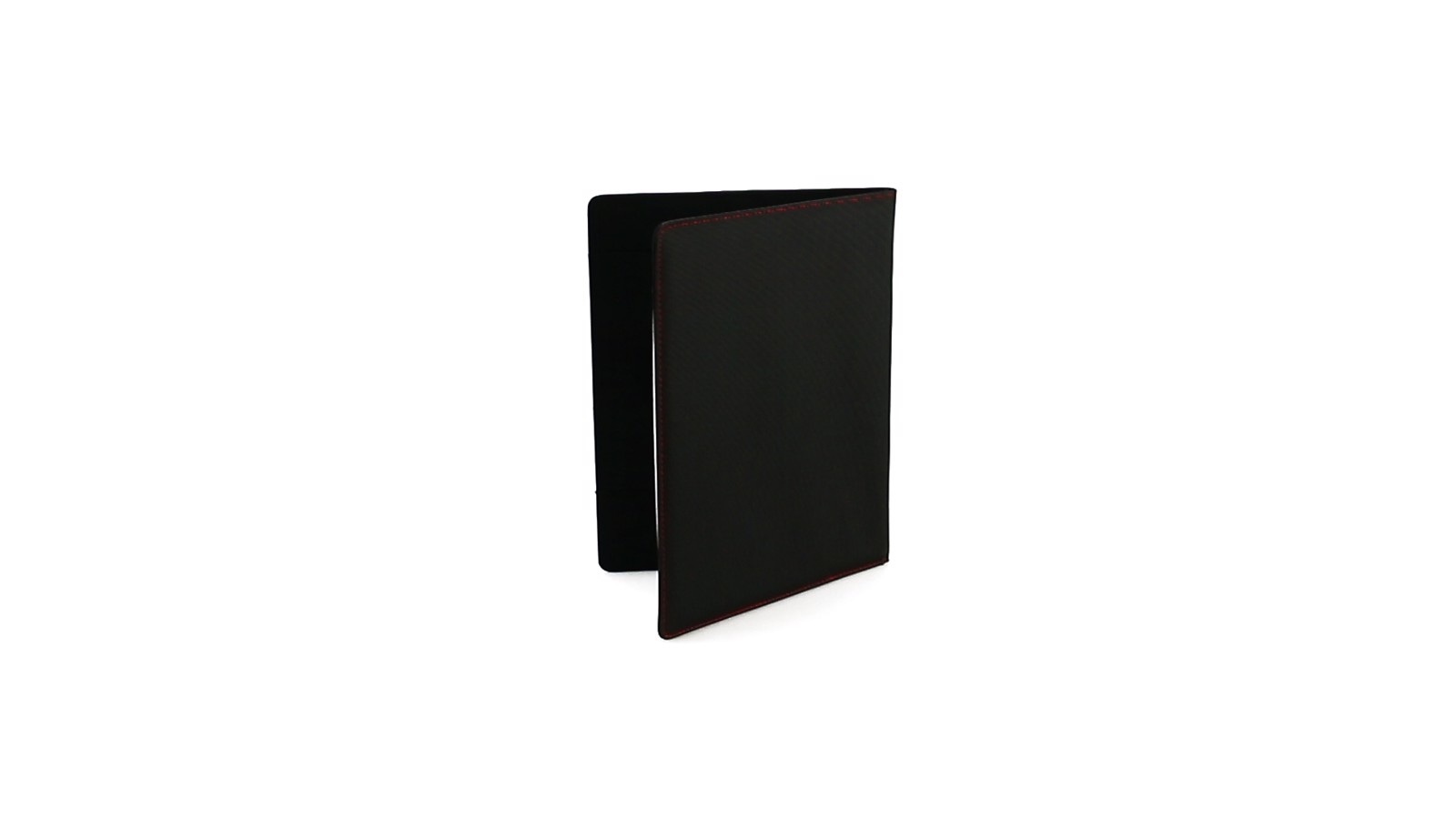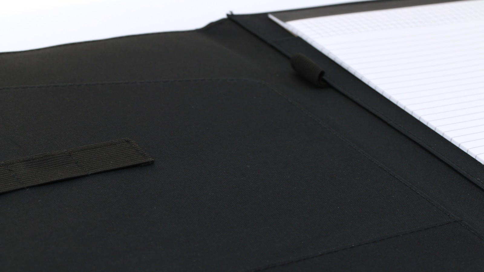 Folder/tablet case in an original combination of leather and polyester 300D. Inside compartment for tablets up to 10 inches. Cover on the front with original colored flap and matching color seams. Inside with a notepad of 20 sheets and striped layout, pen holder, card holder and flap pocket. 20 Sheets Notepad