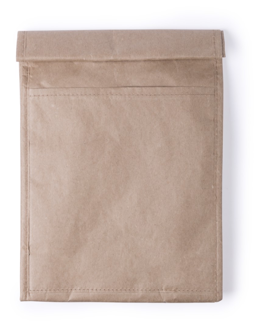 Thermal bag in moist resistant paper of 85g/m2. Isothermal inside in aluminum finishing, with outside pocket and velcro closure. 2.3 liters capacity.
