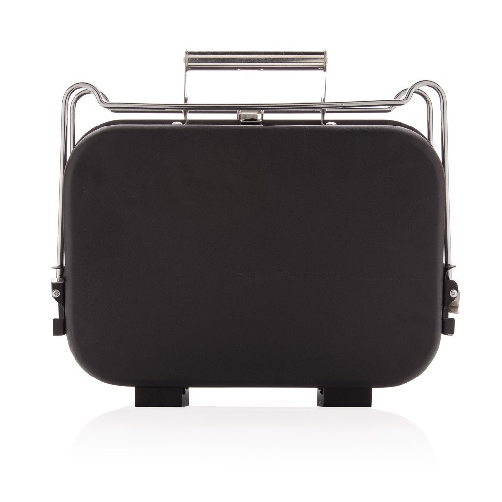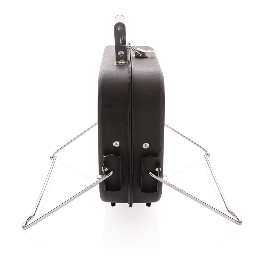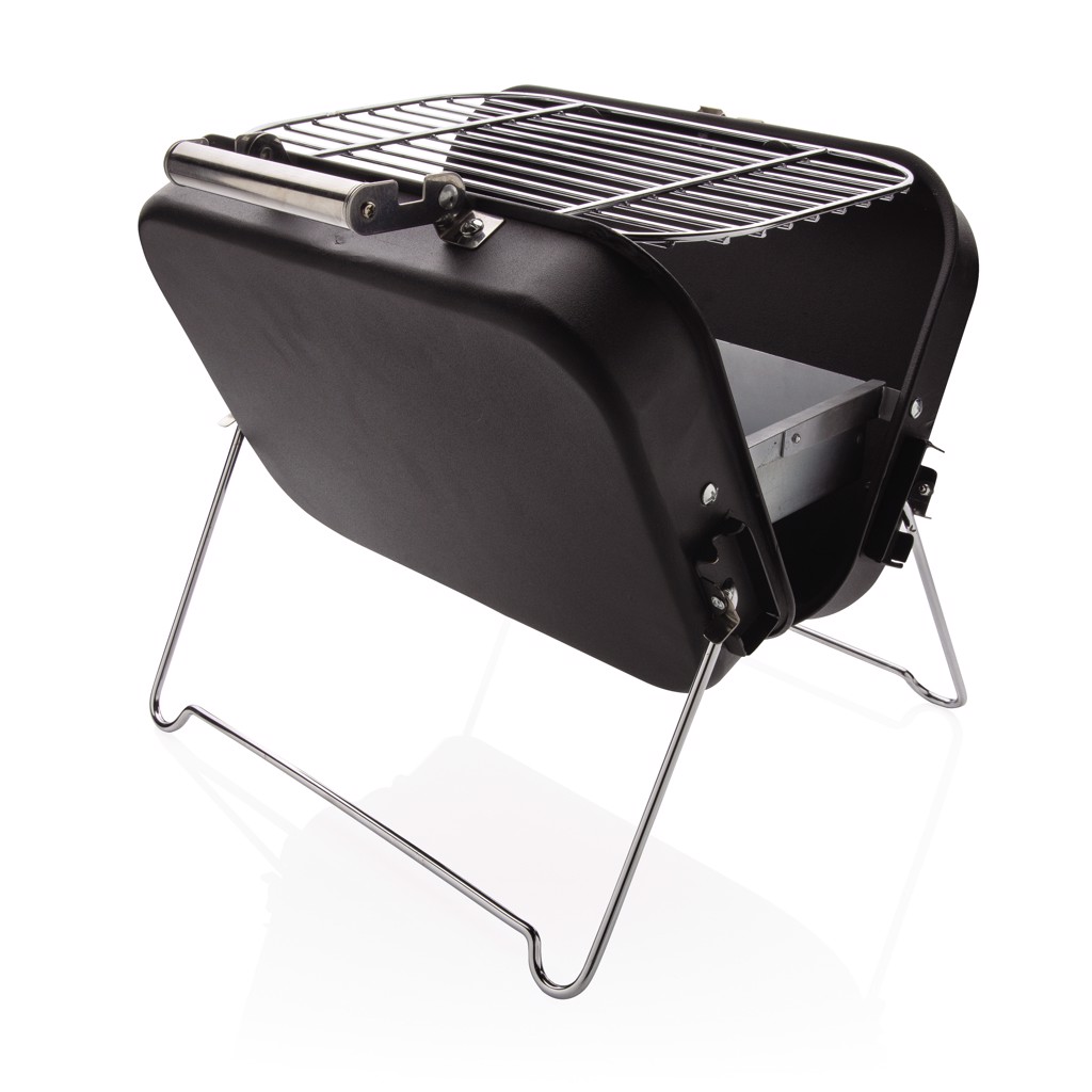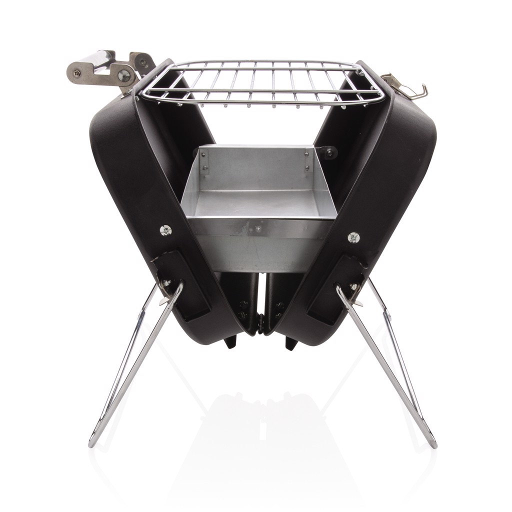 Tragbarer und vielseitiger Grill im Kofferstil mit abnehmbarer Kohlenschale und Tragegriff. Der Grill verfügt über eine leichte und dennoch haltbare Edelstahlkonstruktion mit einer schwarz pulverbeschichteten Oberfläche und einem Verschluss zum Schließen. Perfekt für spontane Picknicks im Freien.