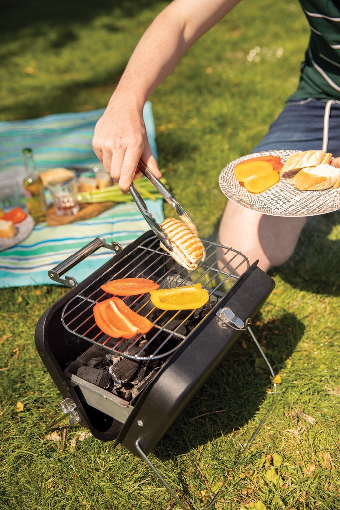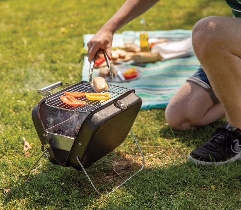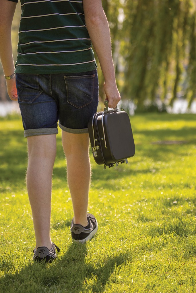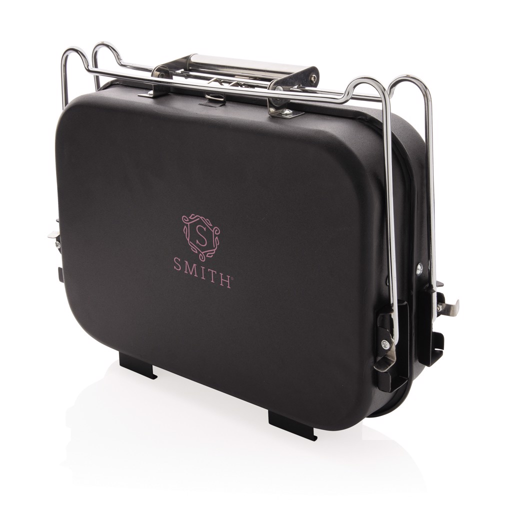 Tragbarer und vielseitiger Grill im Kofferstil mit abnehmbarer Kohlenschale und Tragegriff. Der Grill verfügt über eine leichte und dennoch haltbare Edelstahlkonstruktion mit einer schwarz pulverbeschichteten Oberfläche und einem Verschluss zum Schließen. Perfekt für spontane Picknicks im Freien.