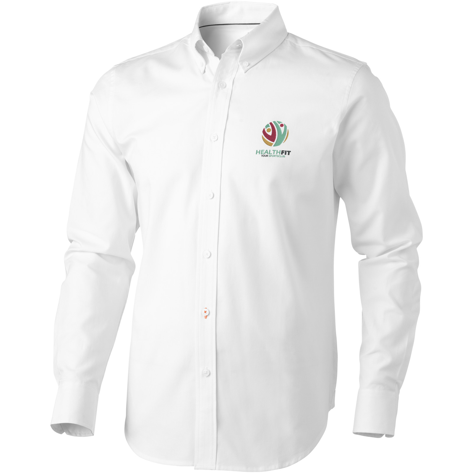 Button-Down Kragen. Mit Knopf einstellbares Bündchen mit Falte. Unteres zweites Knopfloch ist orange umstickt. Satin Nackenband. Gravierte perlmut-farbige Knöpfe. Transfer Hauptlabel für den etikettfreien Komfort.