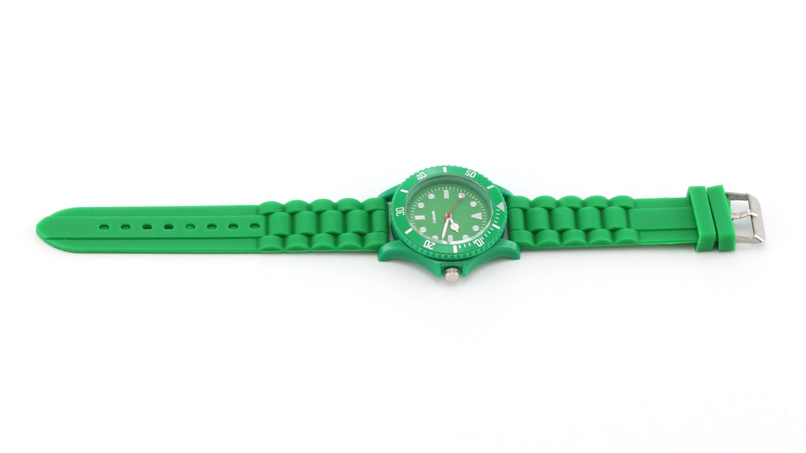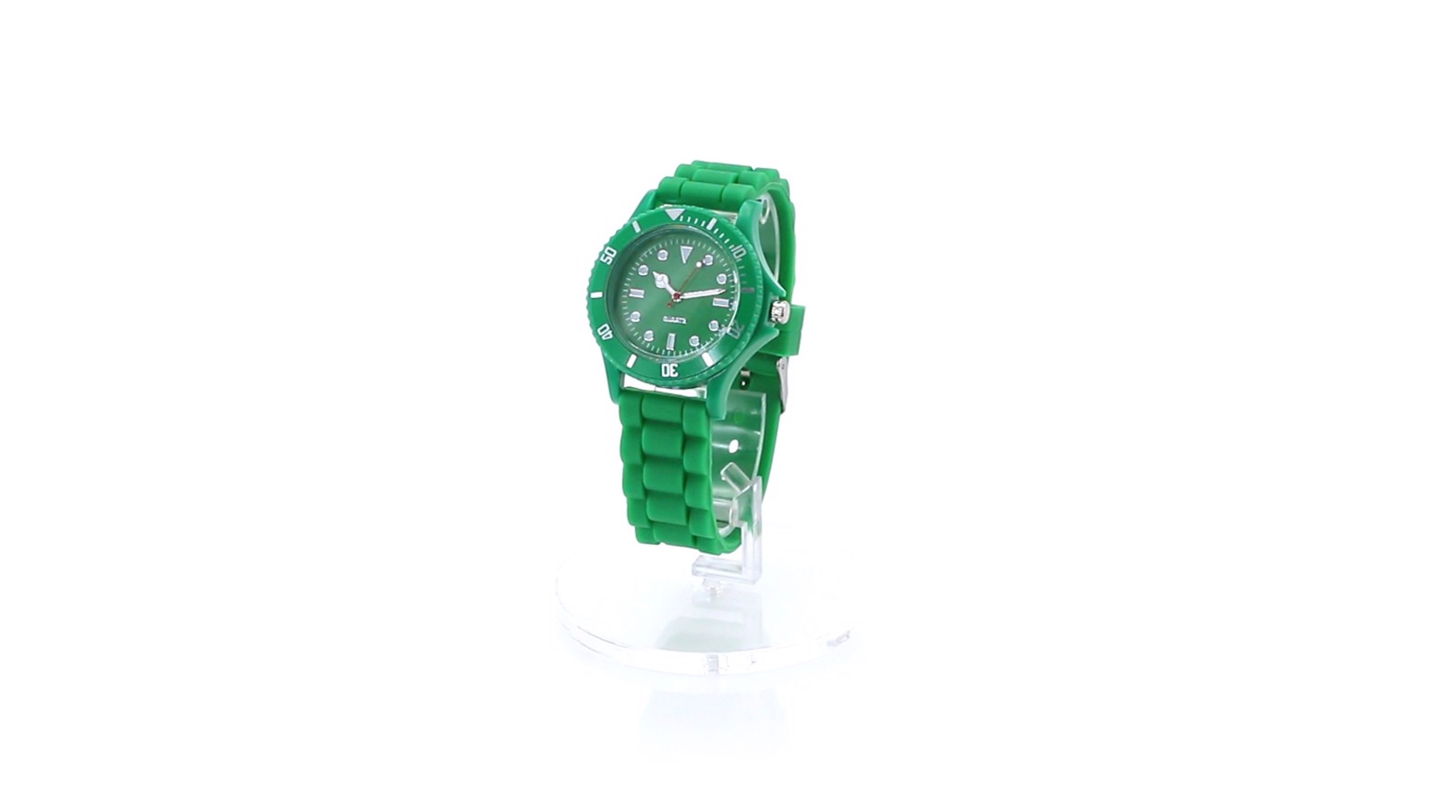 Chronograph wrist watch in an original, brightly colored finish. With chronograph, analogue dial and matching color silicone bracelet. Resistant to water splashes. Presented in an individual bag.