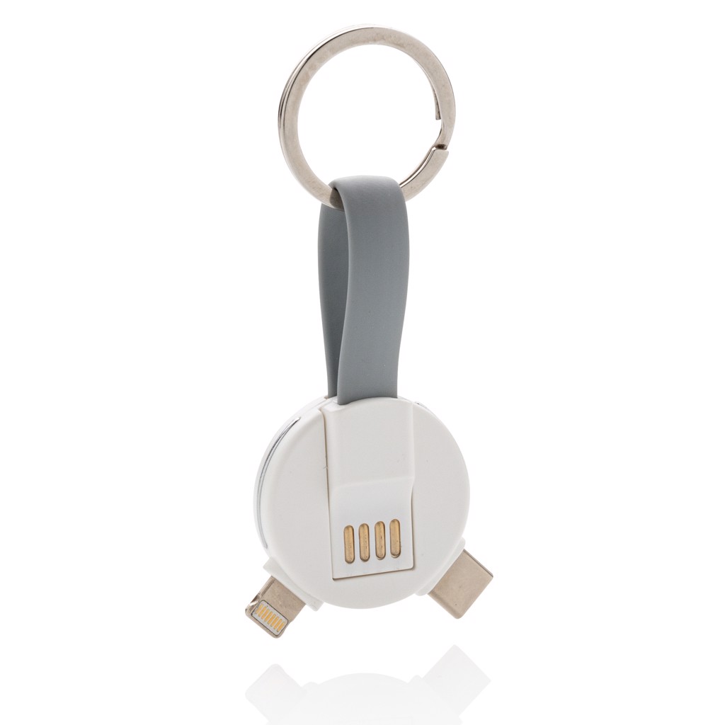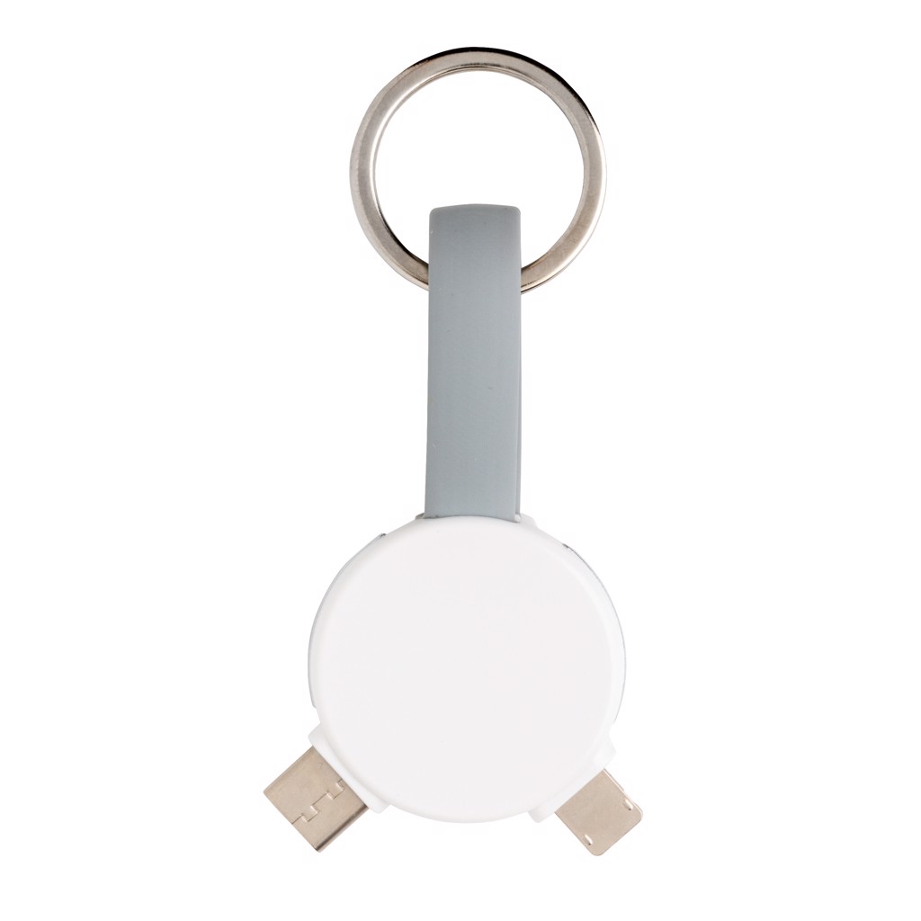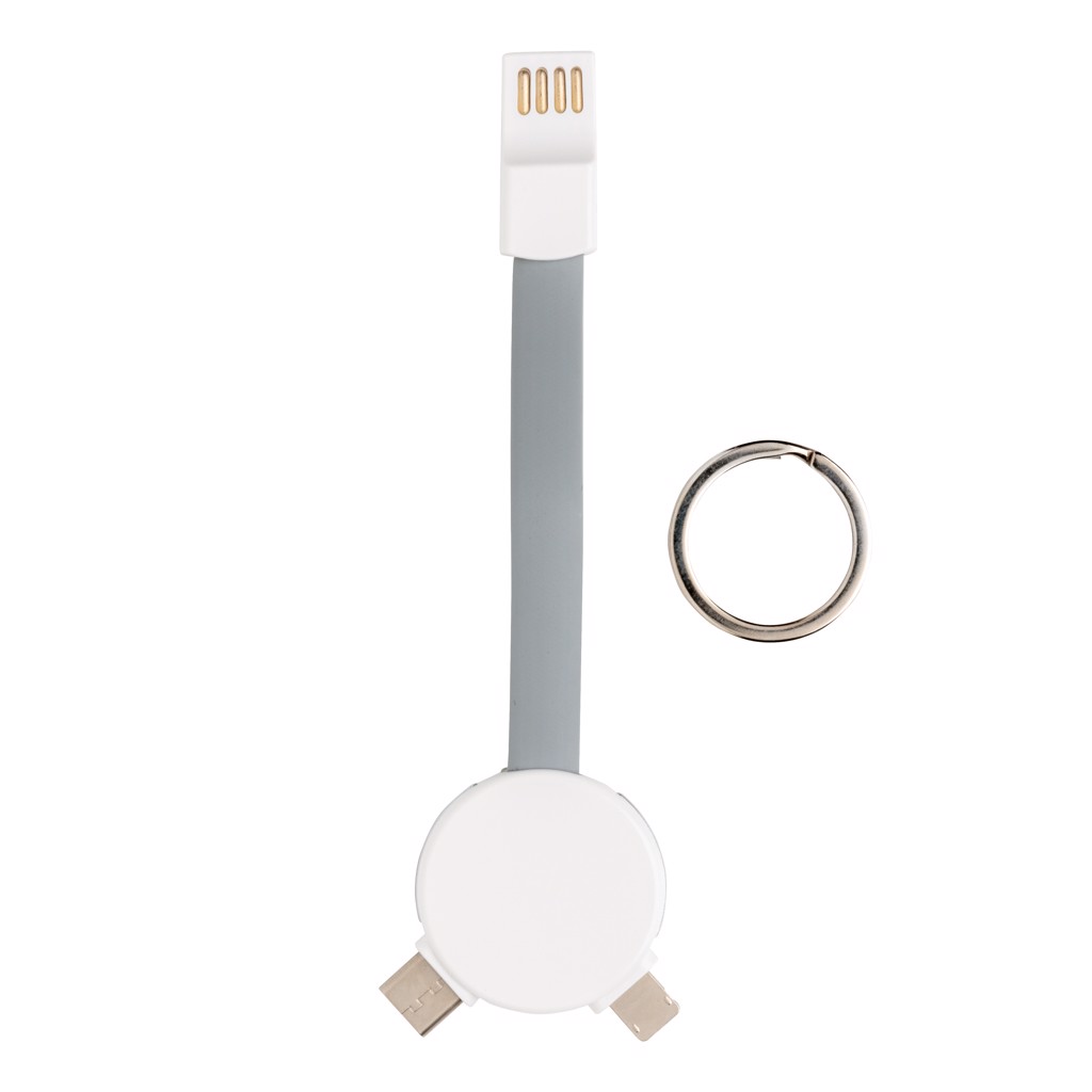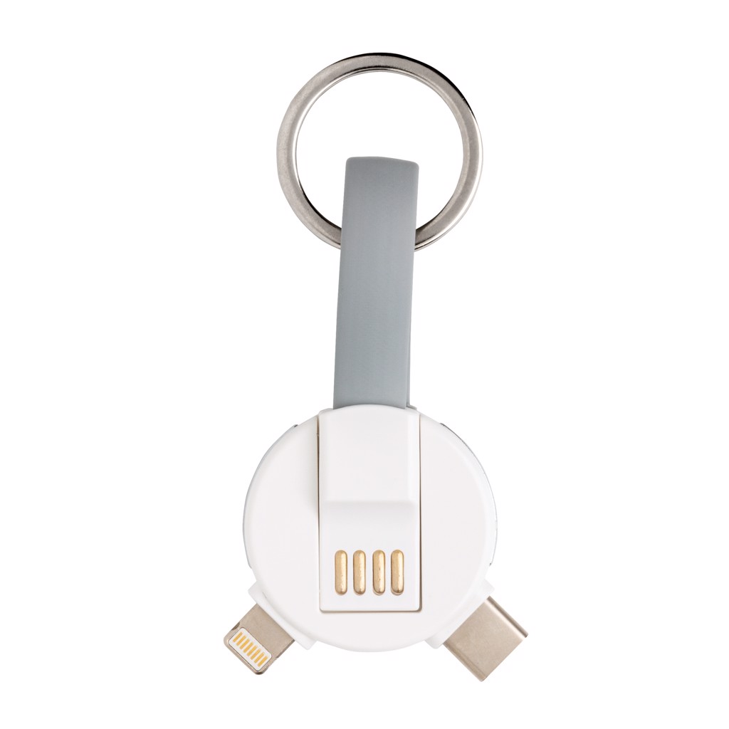 Keychain cable with 3 different connectors: micro USB, type C and a double sided connector for IOS and Android devices. Suitable for charging and syncing data. Both ends can be connected by a magnet to keep the cable compact and easy to carry.