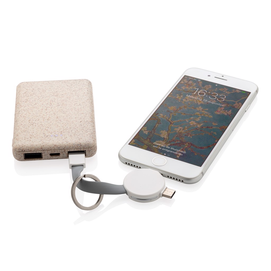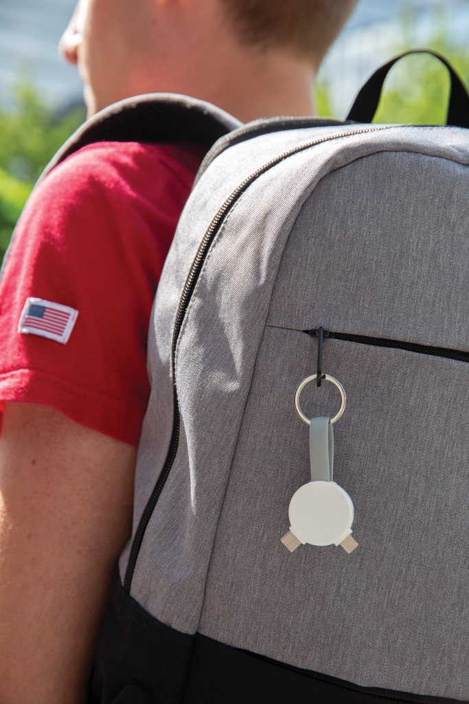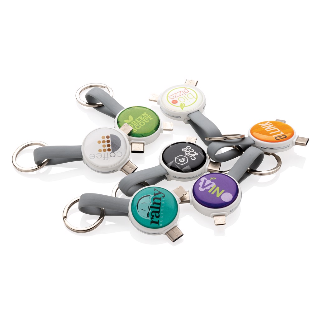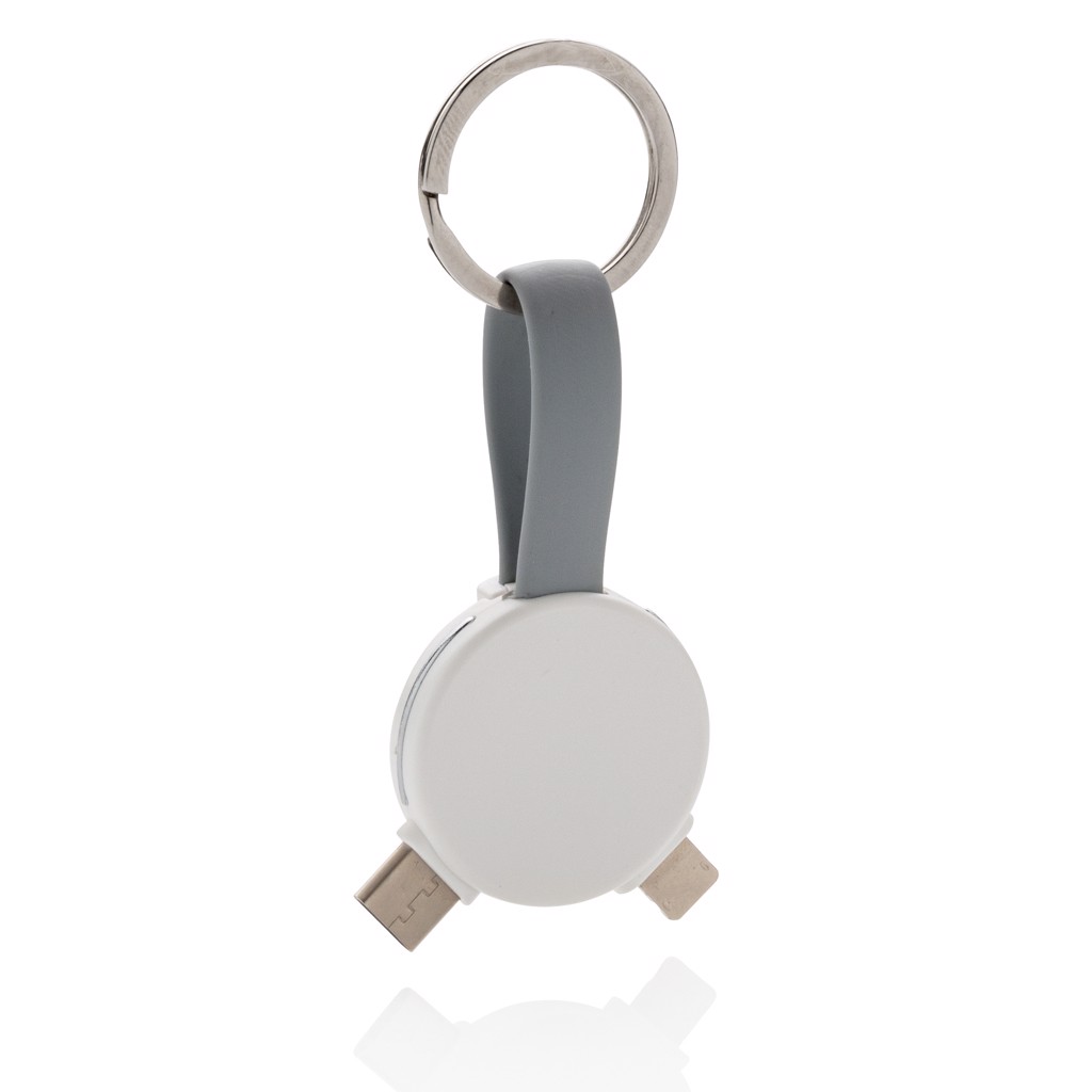 Keychain cable with 3 different connectors: micro USB, type C and a double sided connector for IOS and Android devices. Suitable for charging and syncing data. Both ends can be connected by a magnet to keep the cable compact and easy to carry.