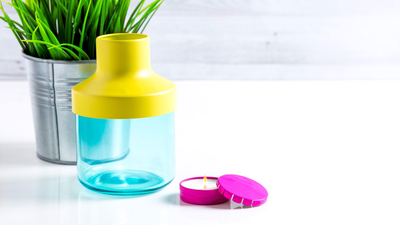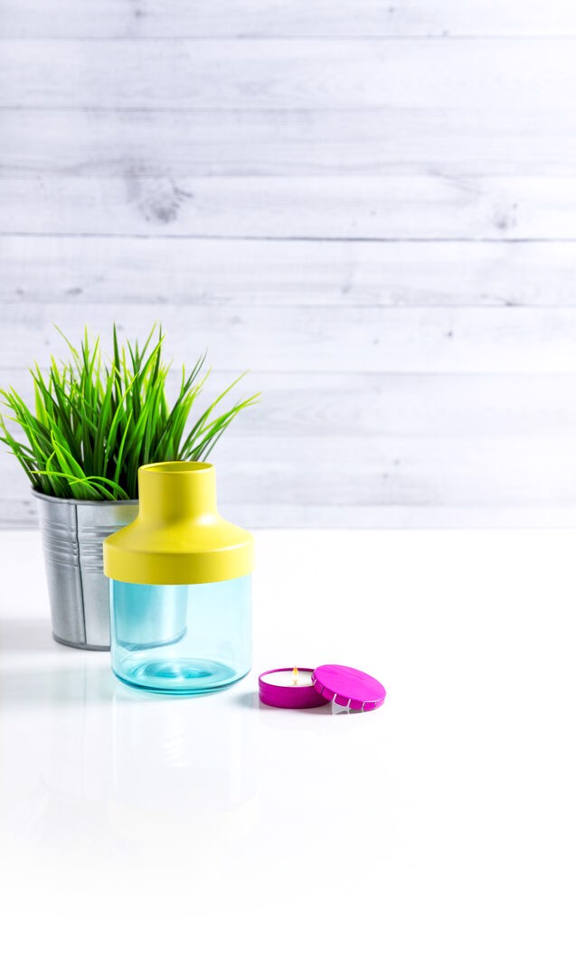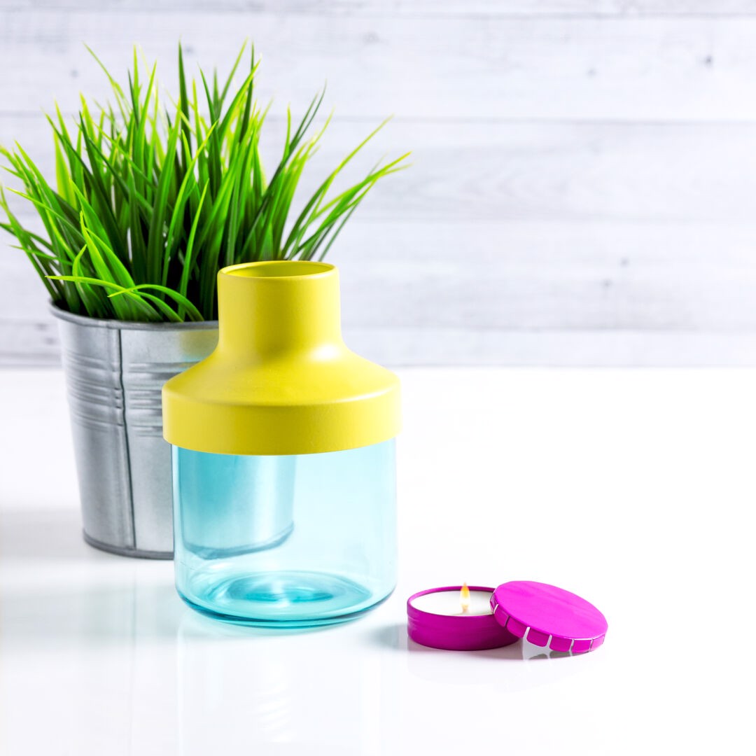Aromatic vanilla fragrance candle presented in an original metallic jar with closure in varied bright tones. Vanilla Aroma