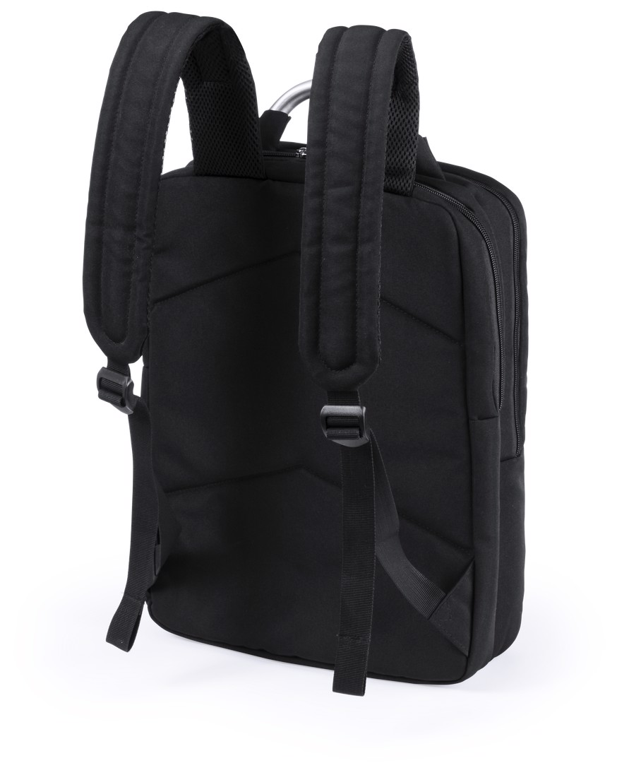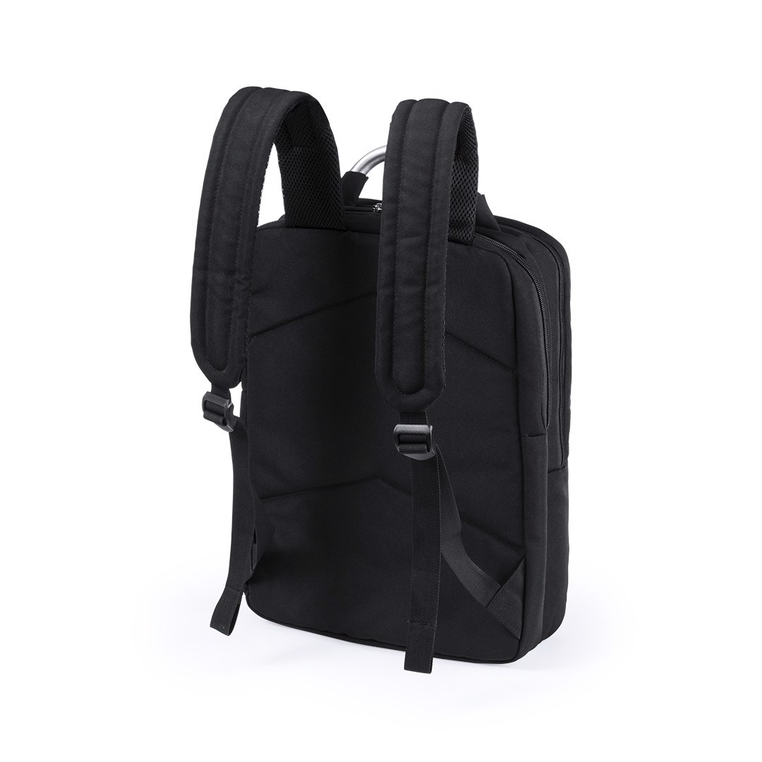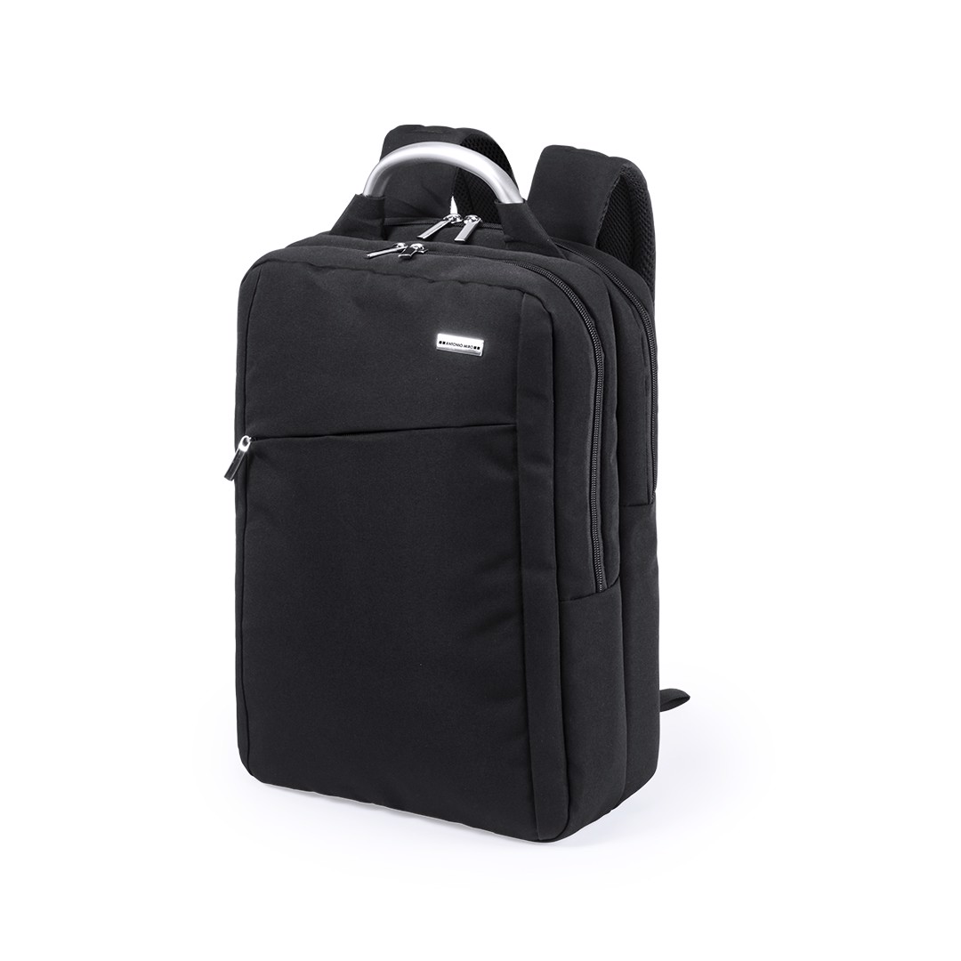 Backpack by Antonio Miró in resistant polyester 1680D of sober design in black color. With zipper closure, front pocket and reinforced metal handle. With ergonomic back padding and shoulder straps, Including an inside padded Notebook compartment of up to 15 inches and a tablet compartment up to 12 inches. Inside covers for pens and smartphones. With the brand logo on front. Padded Laptop and Tablet Compartment. Padded Back and Shoulder Straps
