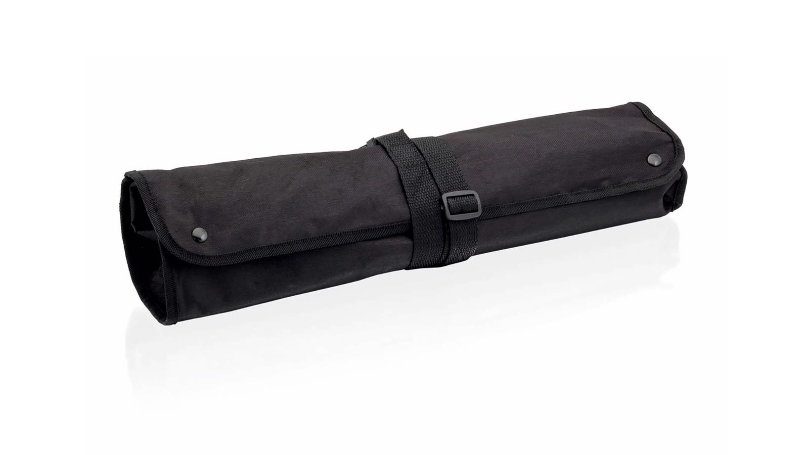 Barbecue set of 7 accessories. Includes pallet, trencher and stainless steel clamps with wooden handle. With padded mitten and dosing cans for salt and pepper. Presented in a resistant, 600D polyester, black color case with metal button closure. With adjustable carrying belt and buckle closure in resistant nylon. 7 Accessories