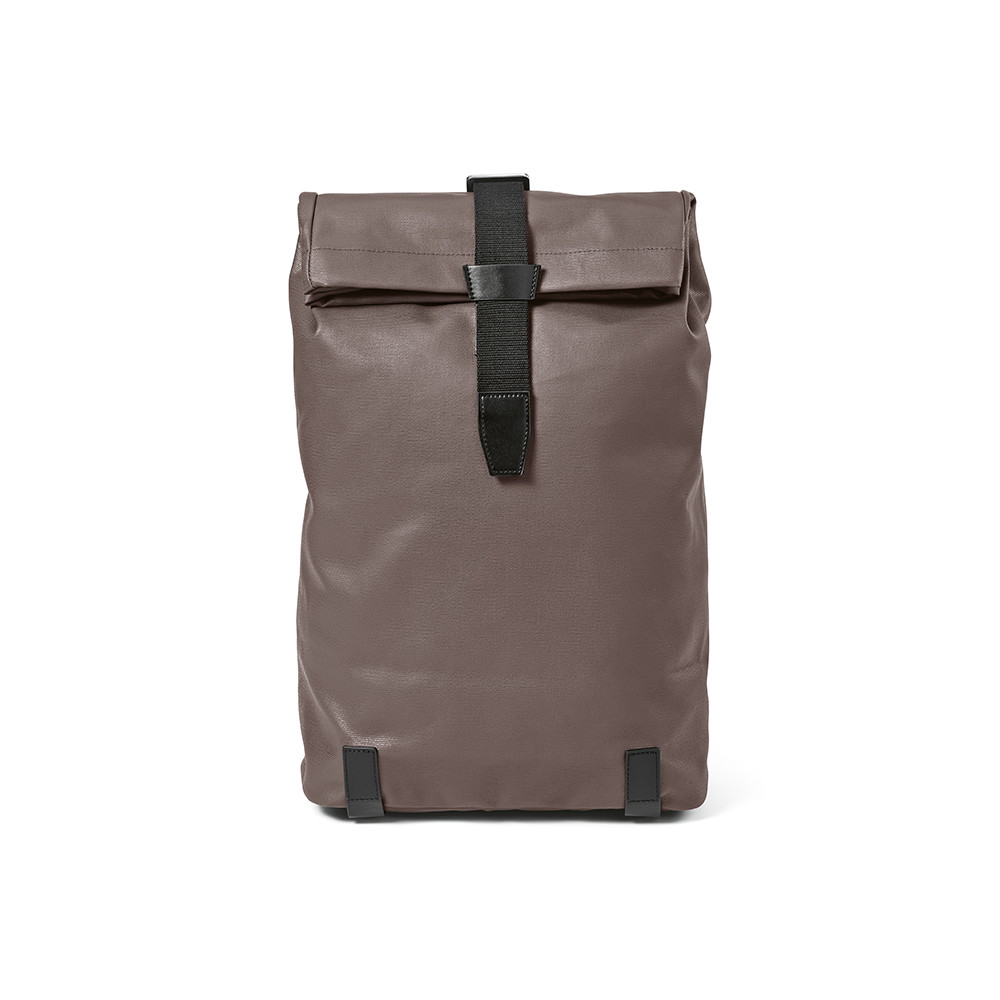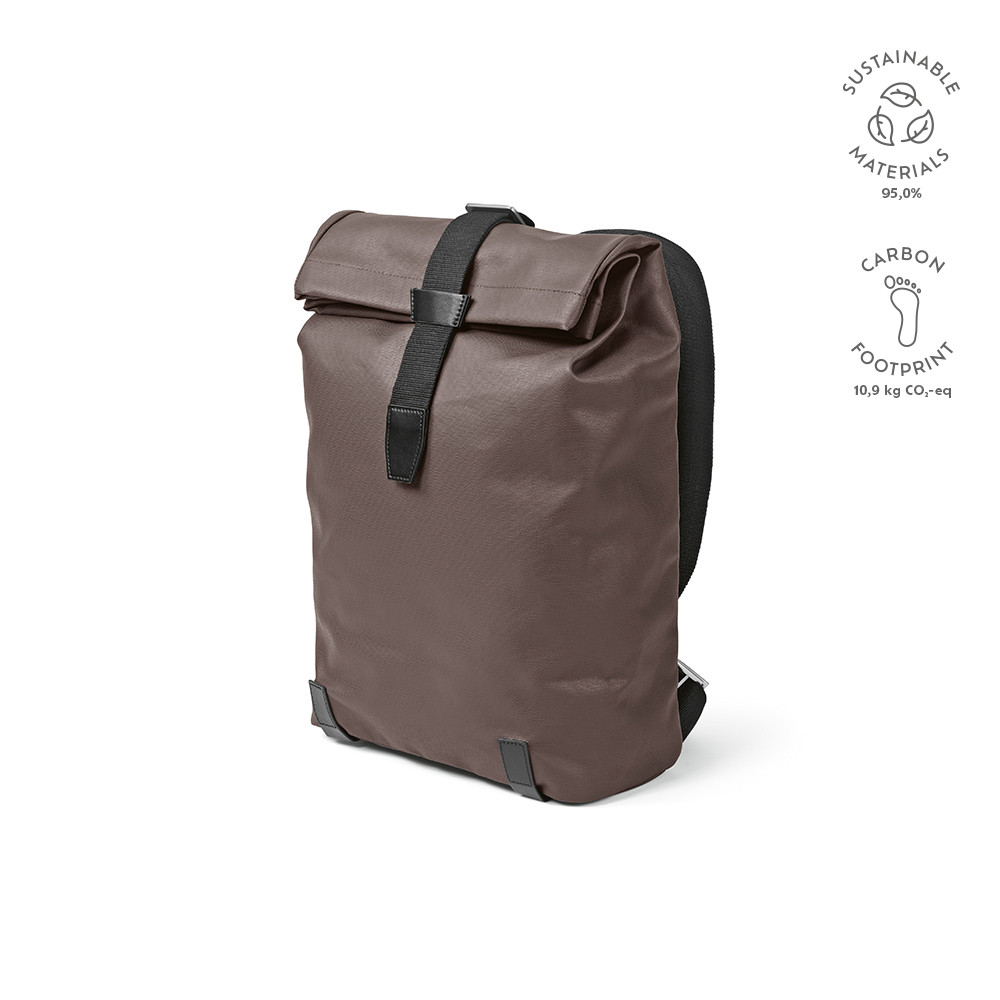 Berlin roll top backpack. Waterproof coated with a 23L capacity and made from recycled cotton canvas with PU coating (340gsm) and recycled PU trim. With a padded compartment for a laptop (17") and 2 internal pockets. Comes in an individual recycled cotton bag.