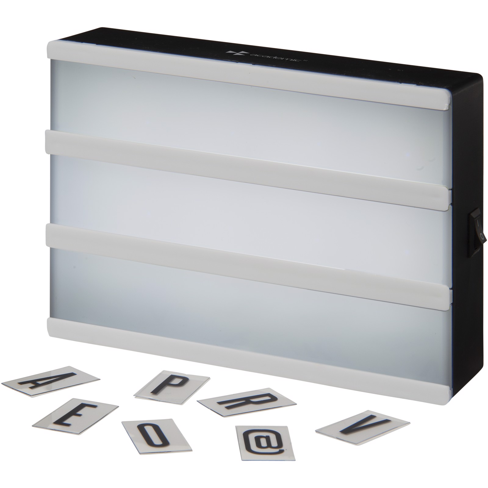 Create your own message with this decorative light box. Includes 60 letters and symbols. On/off switch located on side of light box. Includes 3x AAA batteries and white gift box.