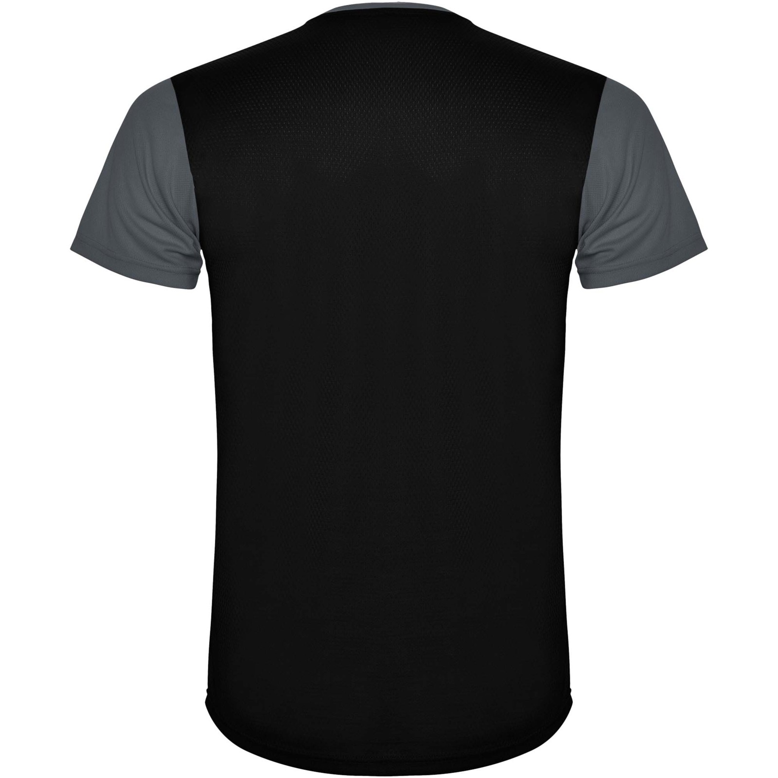 Easy-dry, technical and breathable fabric. Crew neck. Combination of two polyester fabrics on the back and shoulders. Bird's eye fabric on front and breathable 3D mesh fabric at the back. Fabric prepared for moisture absorption. Decorative zigzag backstitch on sides and shoulders. Back pattern slightly longer. Removable label.