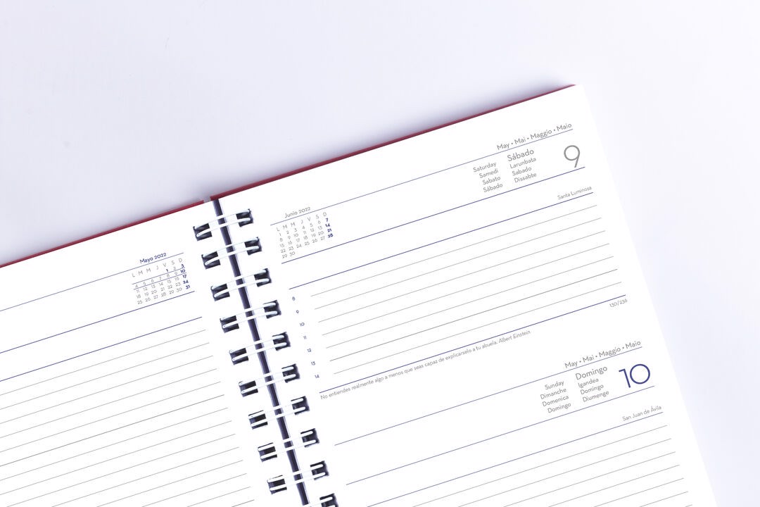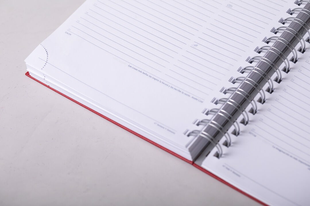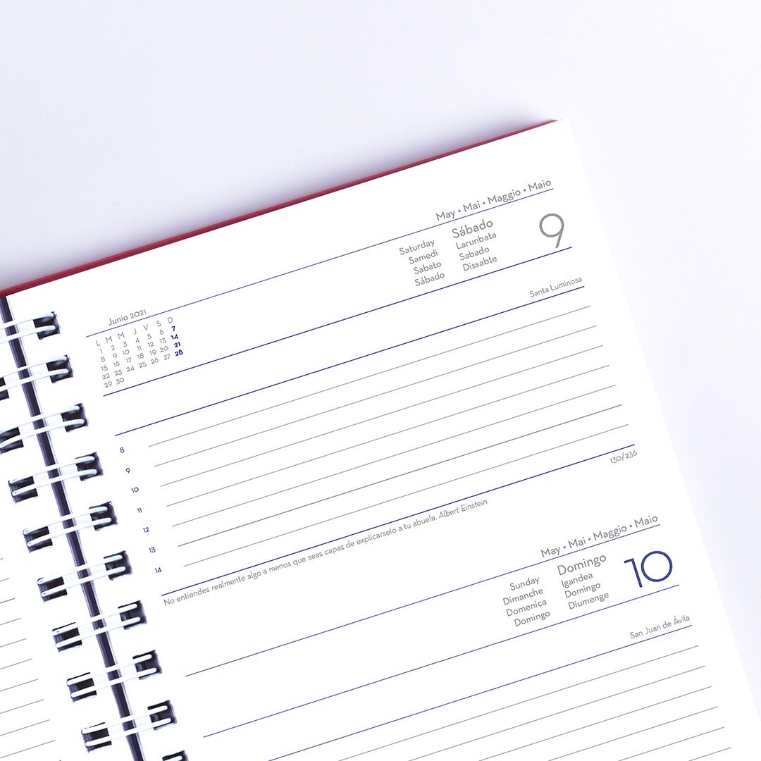 B5 size ring agenda, with covers in resistant and soft PU leather in varied colors. Day page design with phrase of the day. In Spanish, Galician, Basque and Catalan. Presented in an individual box. Daily Page