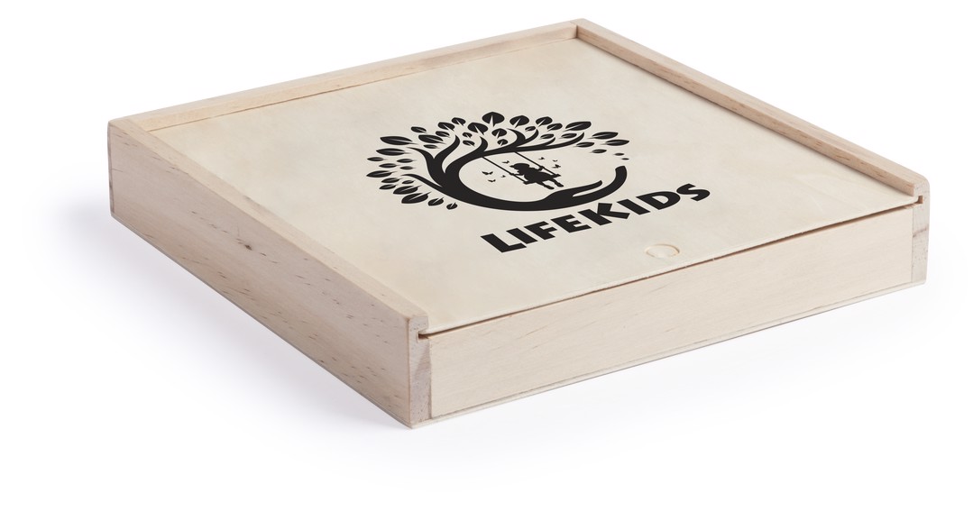 Set of games in wood material. Including mikado, chess, draughts and domino. Presented in a wooden case with lid board. Board with plain side for logo. 4 Games