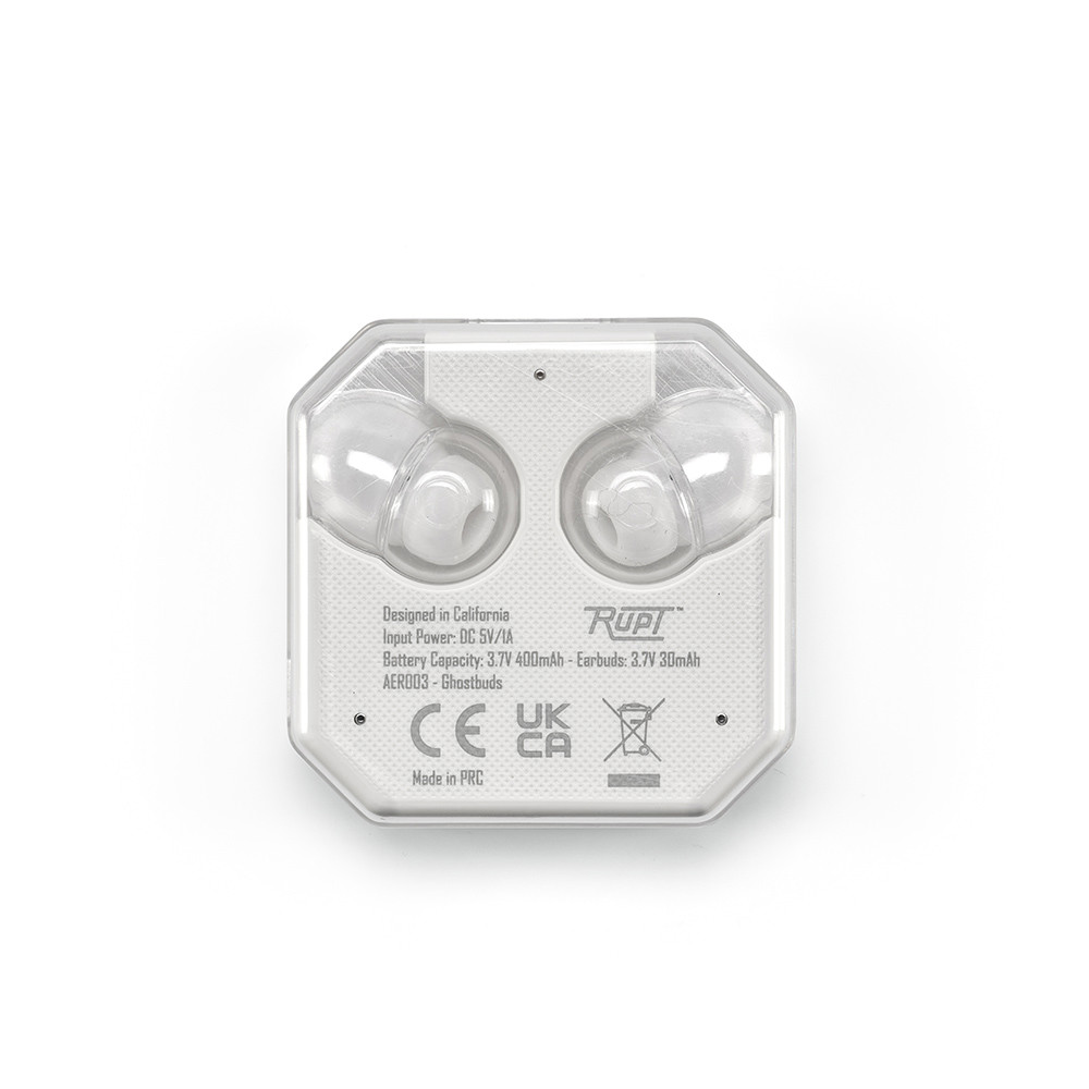 Ghostbuds in rABS. Sleek transparent earbuds deliver exceptional sound with 13MM speaker drivers providing up to 6 hours of playtime on a single charge. They are housed in a compact charging case and take about 2 hours to charge through the USB-C connector. Additional technical features include a 400 mAh battery and a frequency range of 100-20kHz. Built-in microphone for hands-free calls with a comfortable in-ear design. Packed inside an individual kraft box.