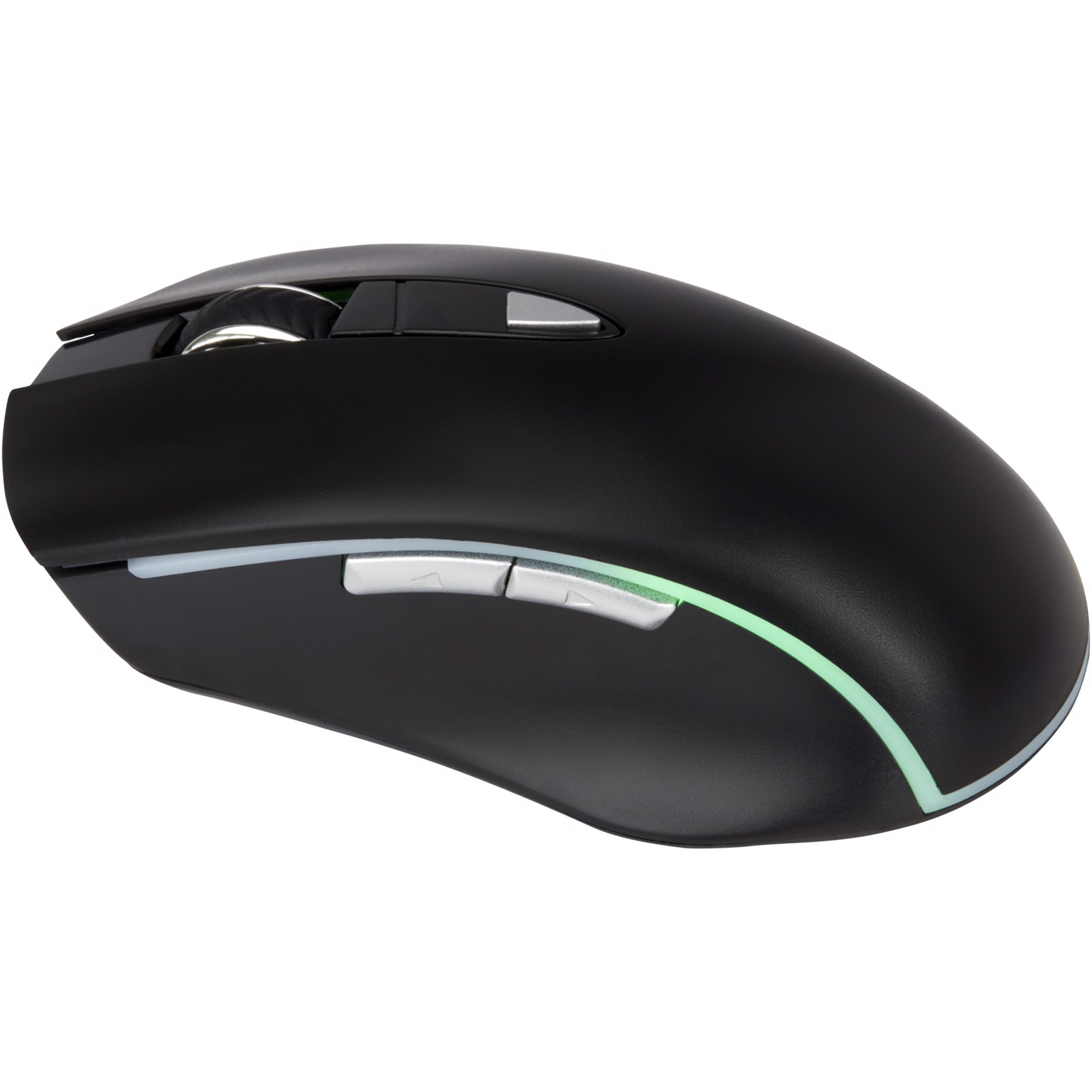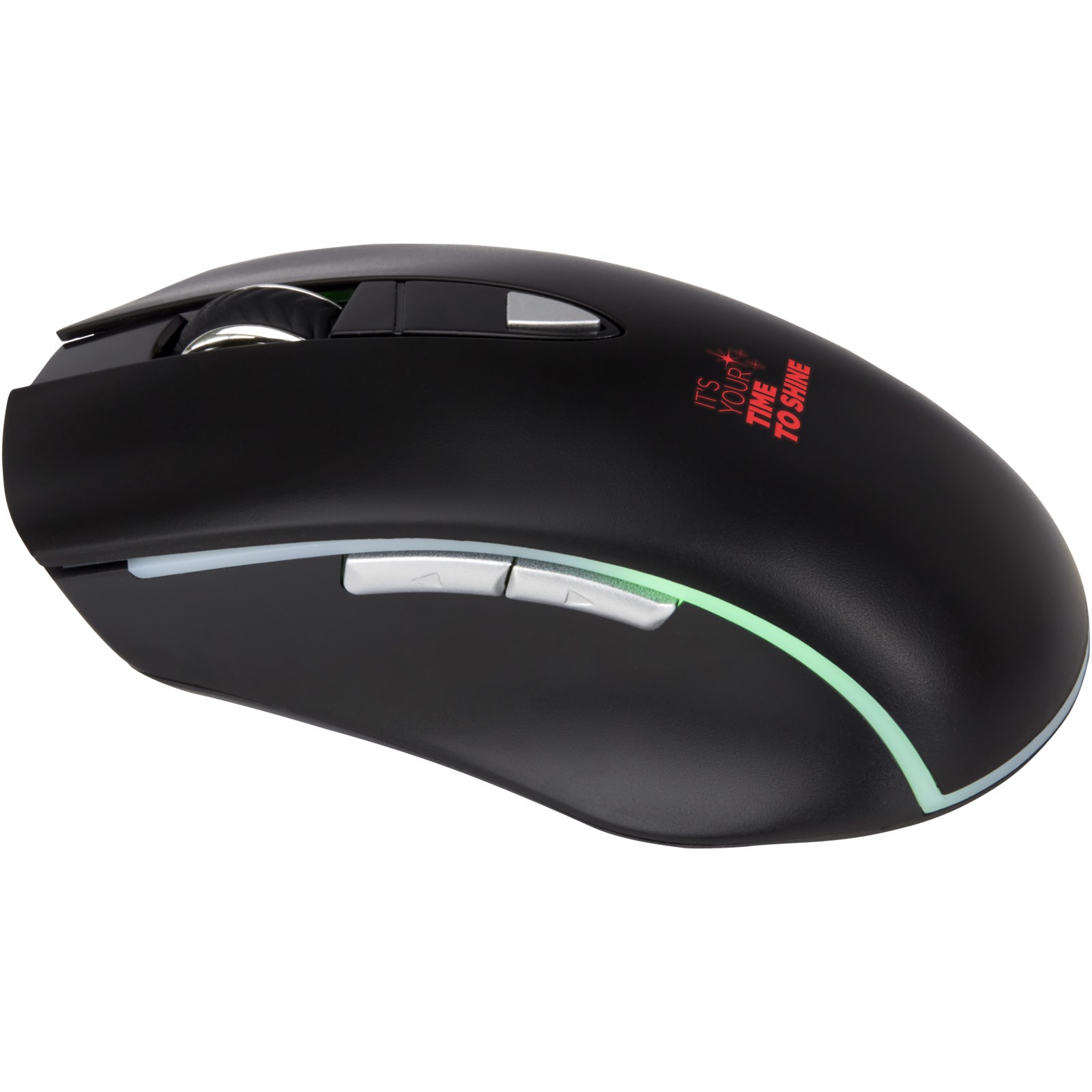Ergonomic wireless mouse that fits the palm of the hand perfectly. Great wrist support for long hours of working/gaming. The mouse has 3 DPI settings (800/1200/1600) for all sensitivity requirements. The built-in 400mAh rechargable li-on battery provides up to 20 hours of use with LED ON. When decorated with laser engraving the logo will light up and shine. LED colour changes randomly.