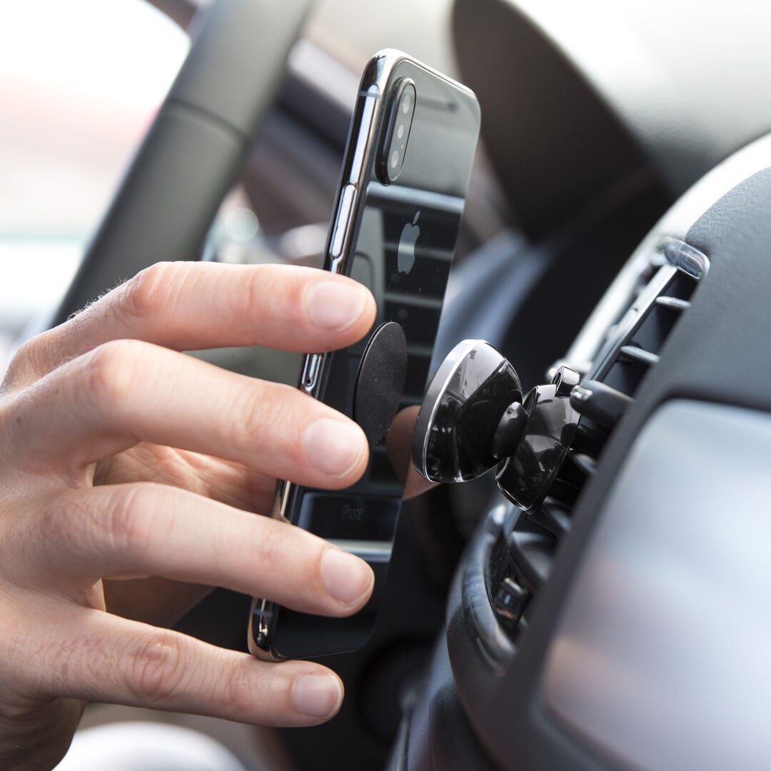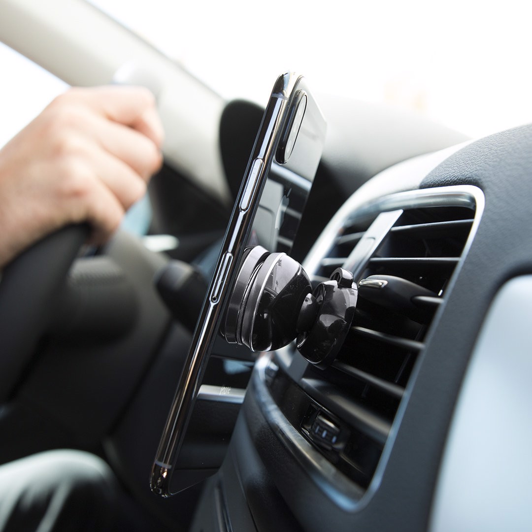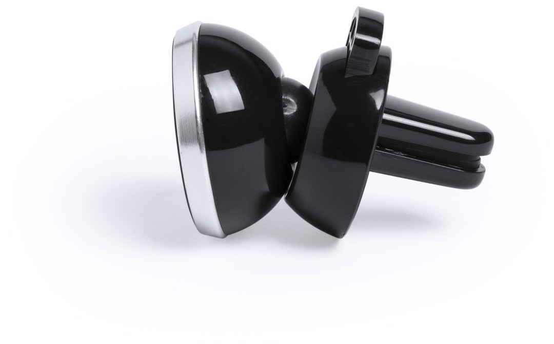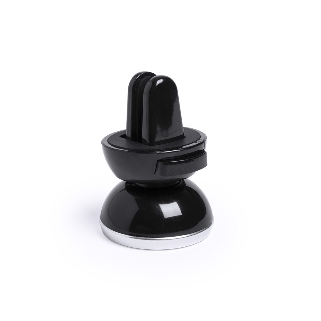 Magnetic holder for smartphone with minimalist design and elegant black aluminum finish combined with eye catching metallic colors. With telescopic fixing system for car ventilation grille and adhesive accessory for smartphone. Presented in an attractive design box. Adhesive and Magnetic
