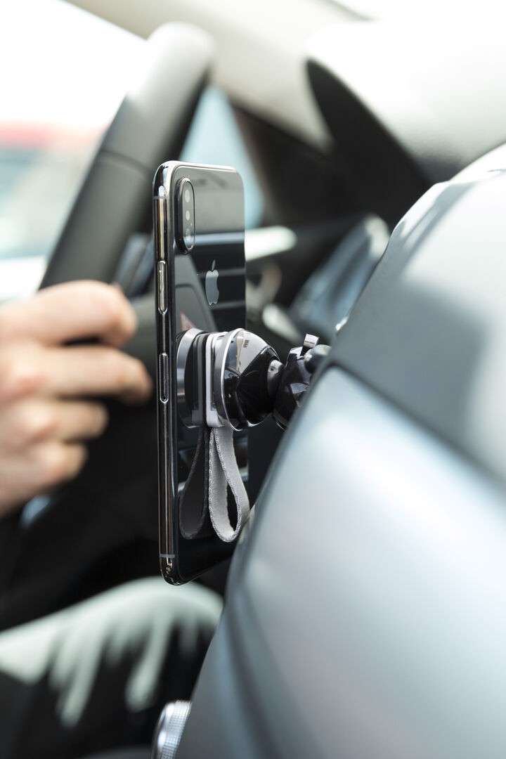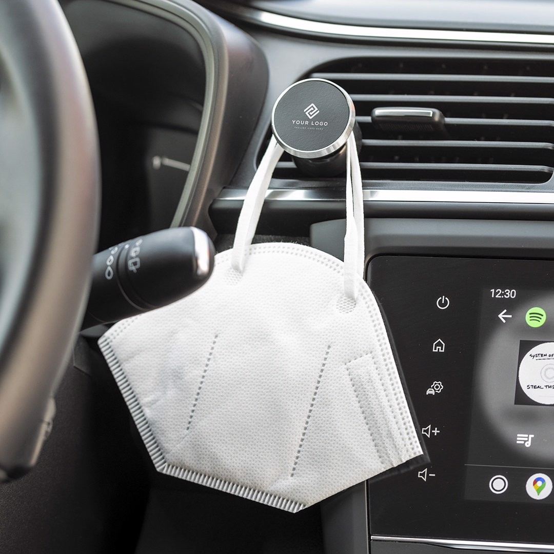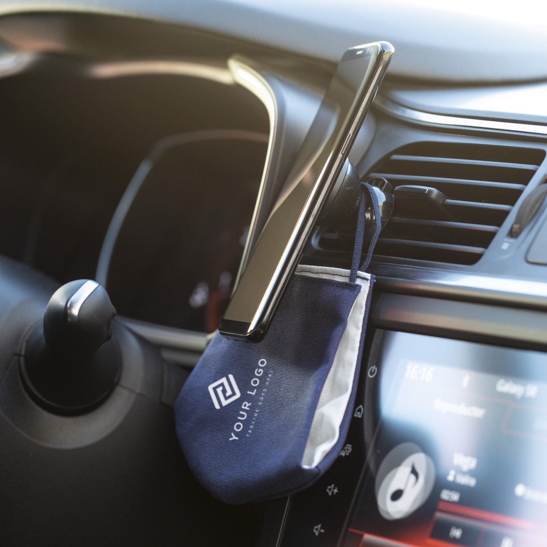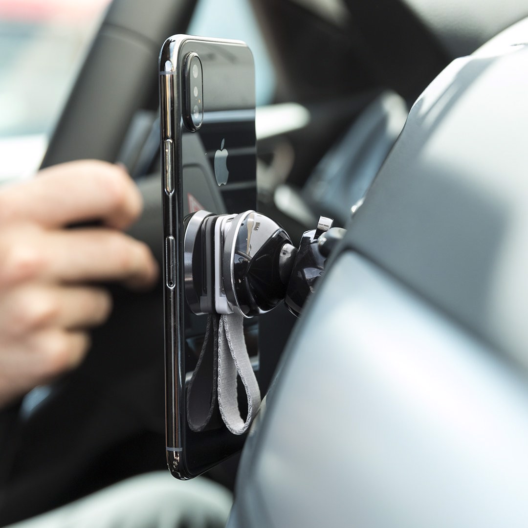 Magnetic holder for smartphone with minimalist design and elegant black aluminum finish combined with eye catching metallic colors. With telescopic fixing system for car ventilation grille and adhesive accessory for smartphone. Presented in an attractive design box. Adhesive and Magnetic