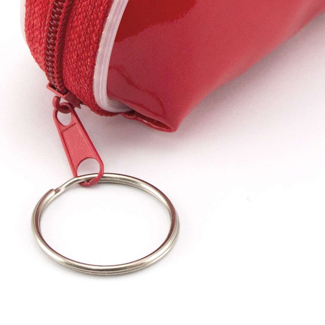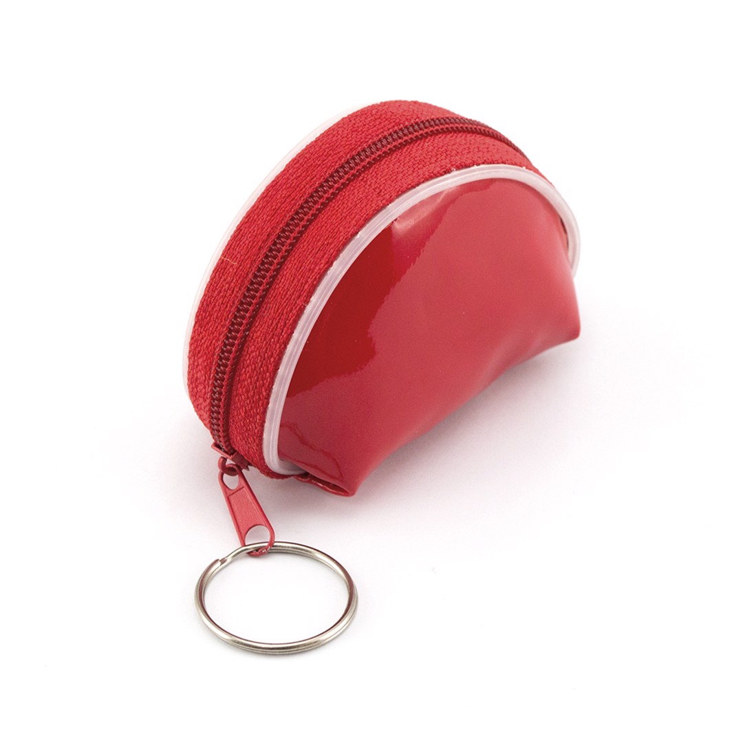 Keychain coin purse of semicircular design in material 100% PVC of varied and bright tones. With matching color zipper closure, silver colored piping and handle ring.