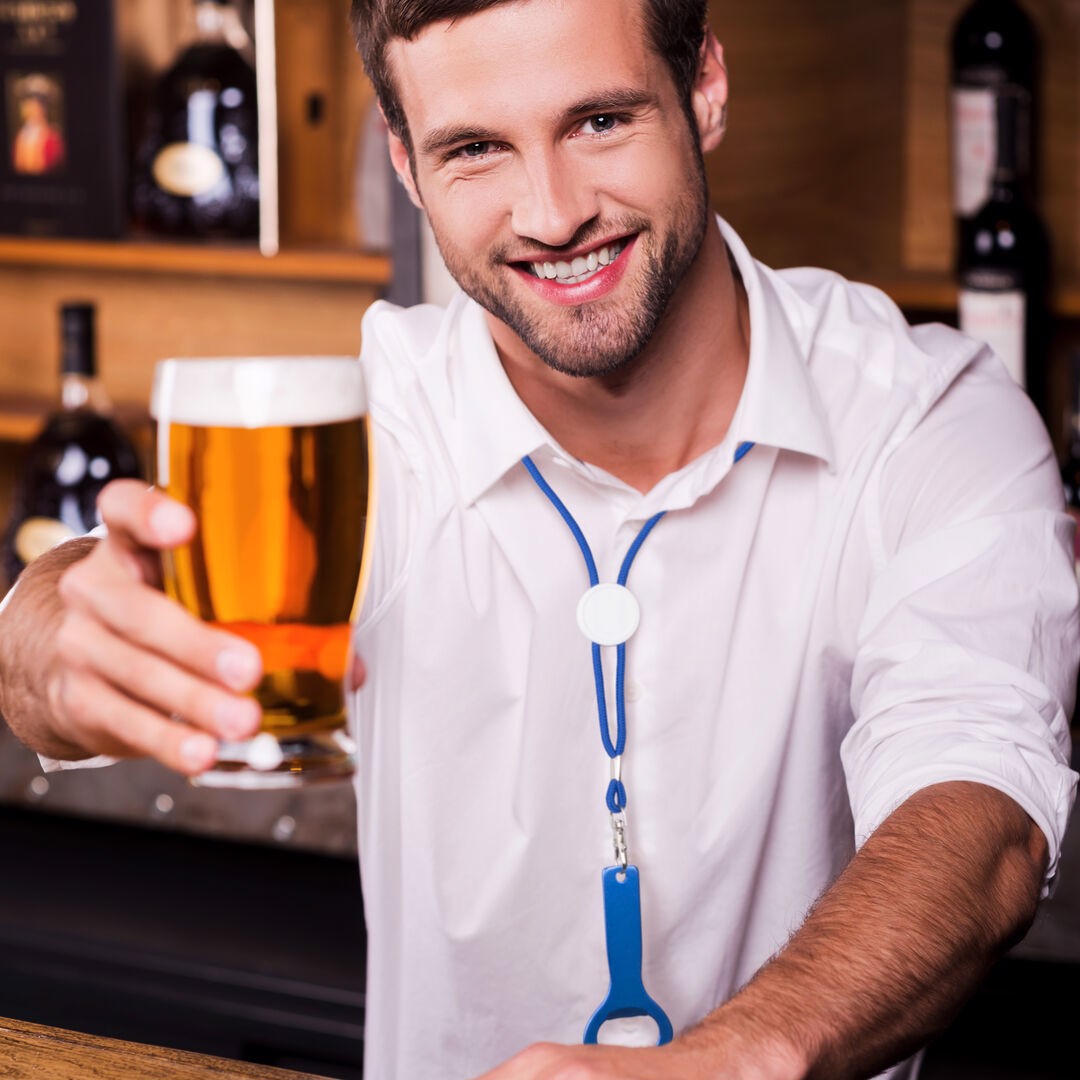 Lanyard in resistant and soft polyester string in a varied range of bright tones. With detachable snap closure on collar, metal carabiner accessory and central pad for printing. Safety Catch
