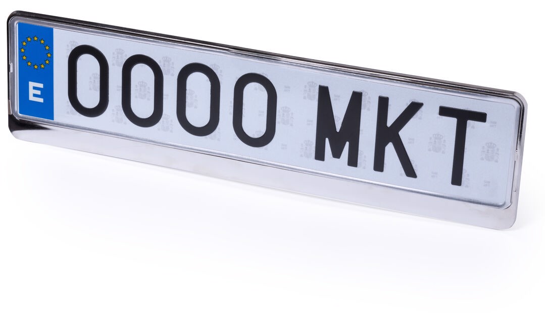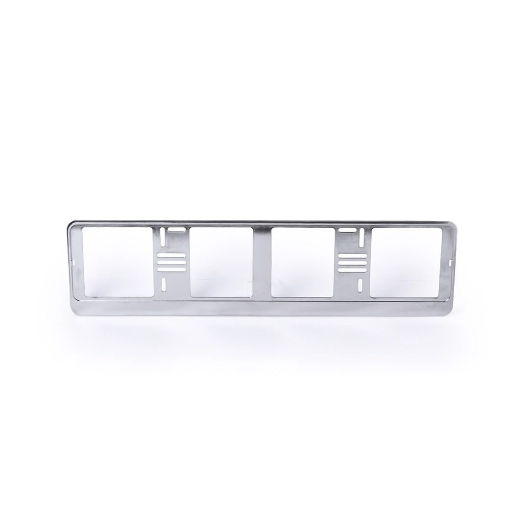 License plate holder in silver-grey finish for rectangular elongated design plates.