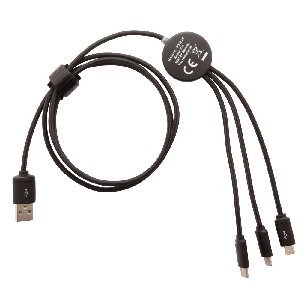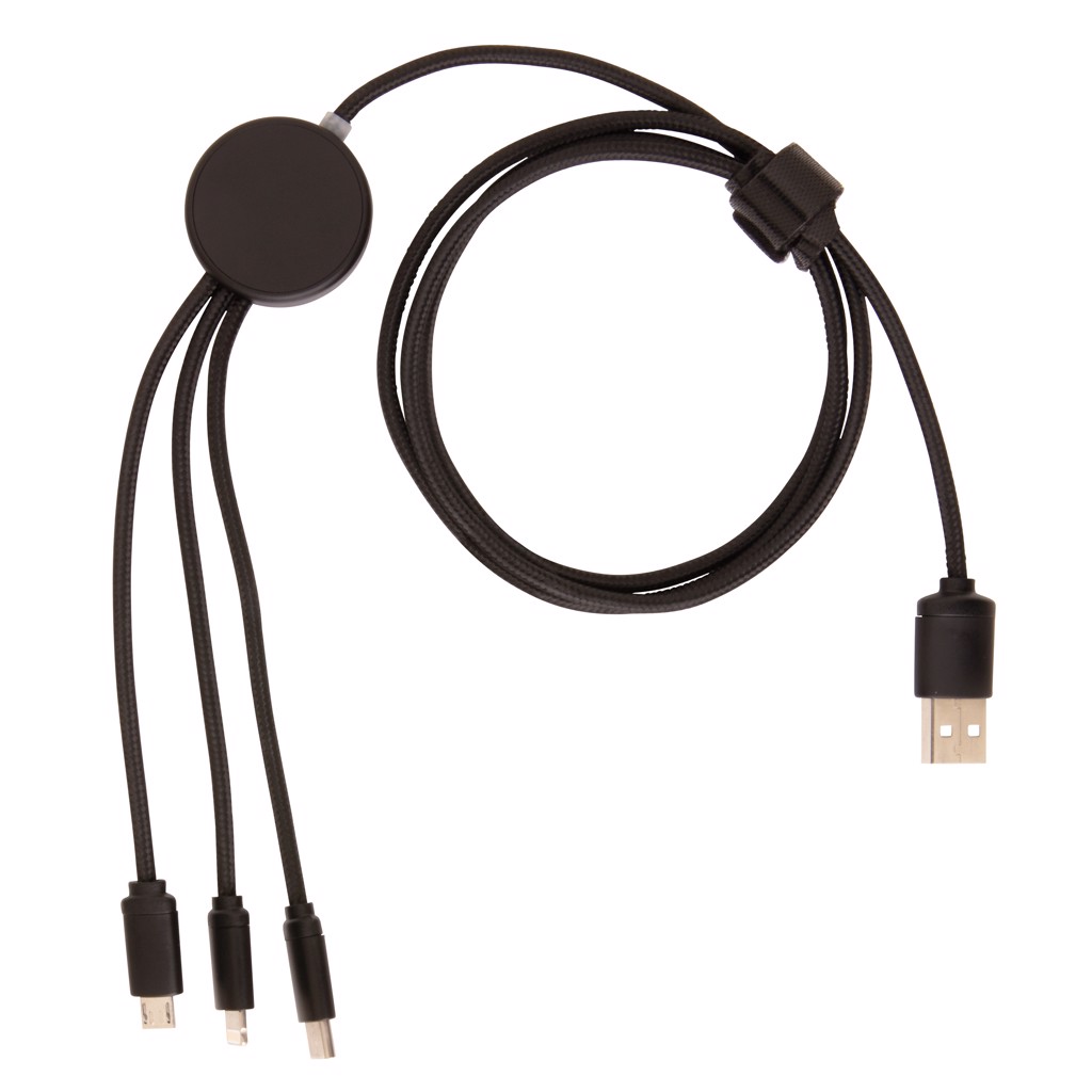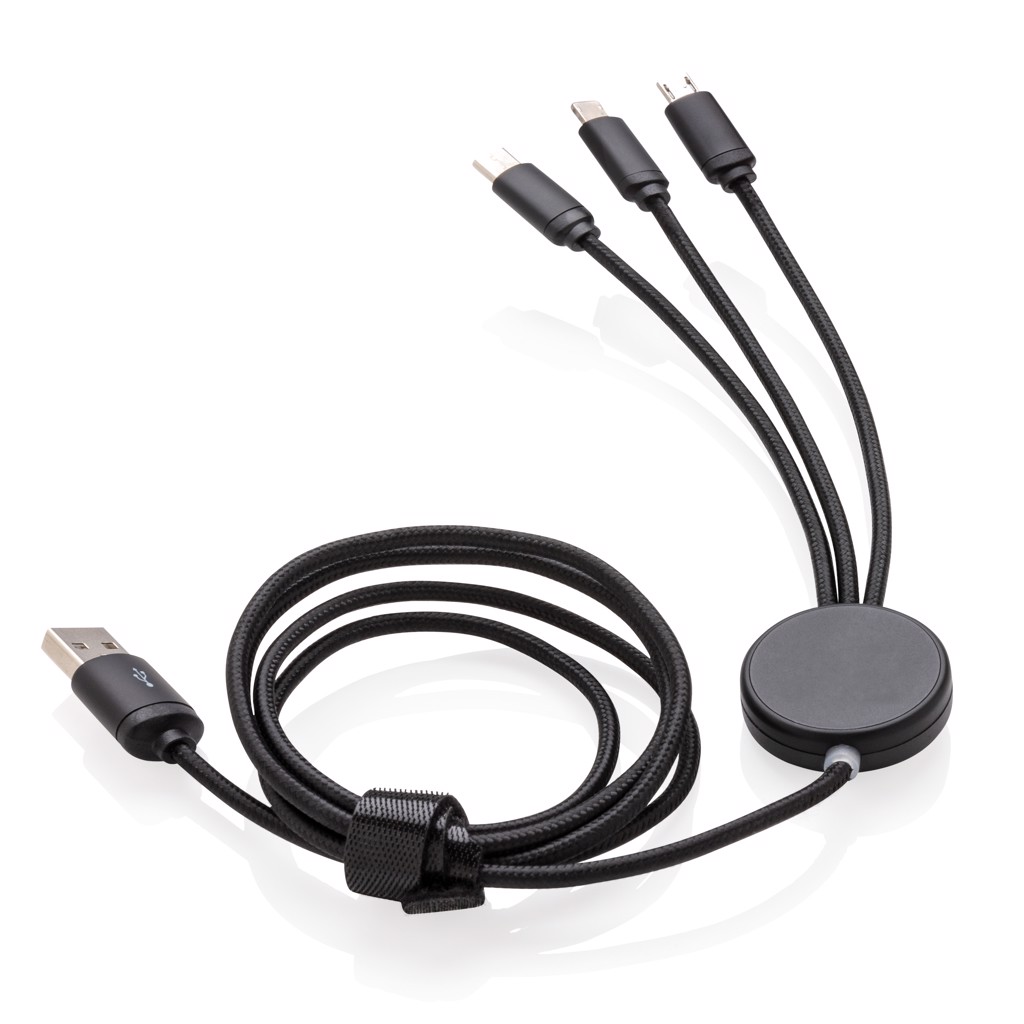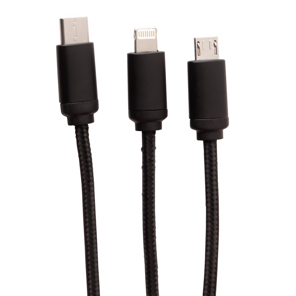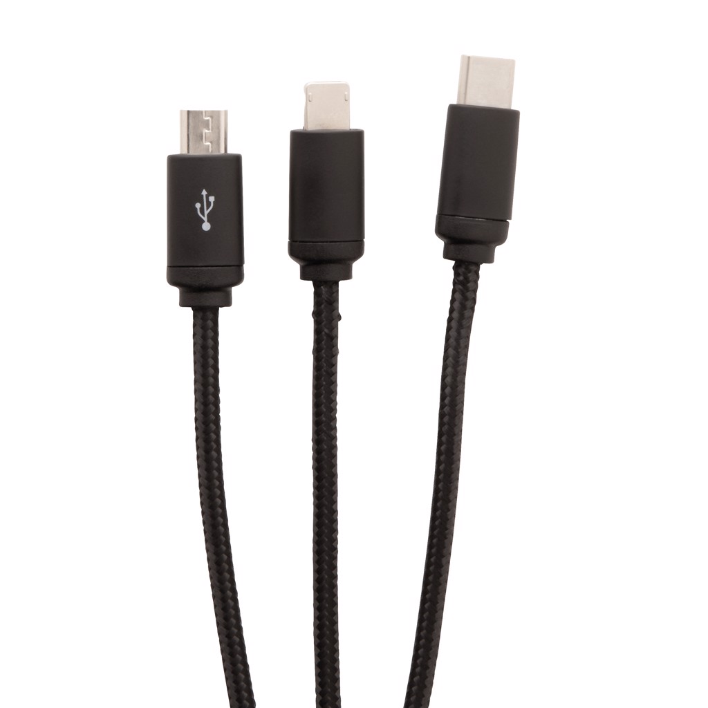 Luxury braided nylon 3-in-1 cable with type C, micro USB and double-sided connector for iOS. With middle part to engrave your logo that will light up when using the cable for optimal exposure. Suitable for charging. Length 120cm.