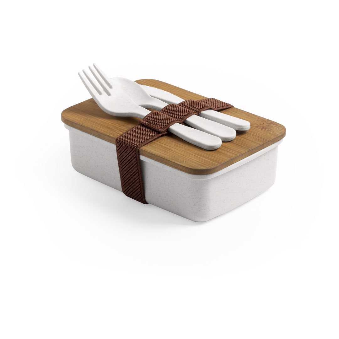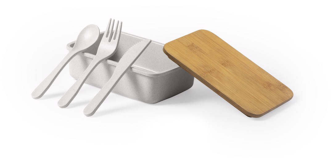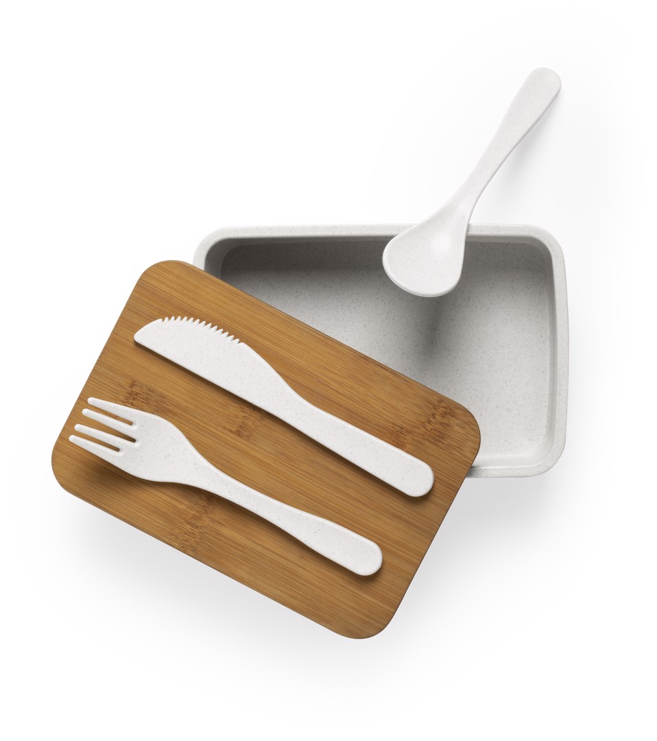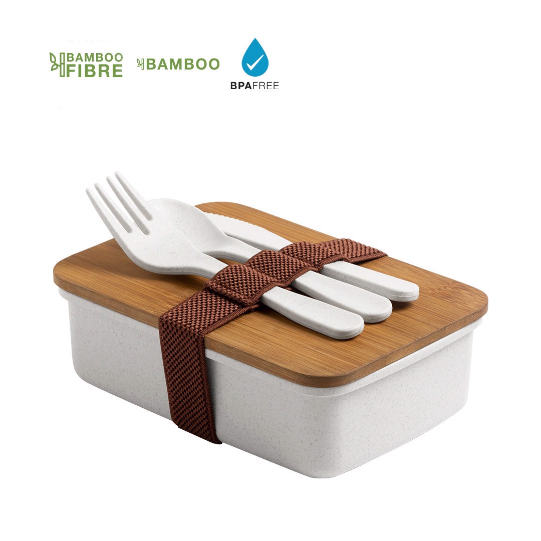 700 ml capacity lunch box in nature line. In bamboo fibre, with lid in polished bamboo. Security strap with fork, spoon and knife. BPA free and suitable for freezer. 700 ml