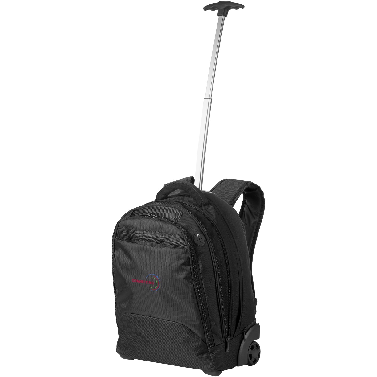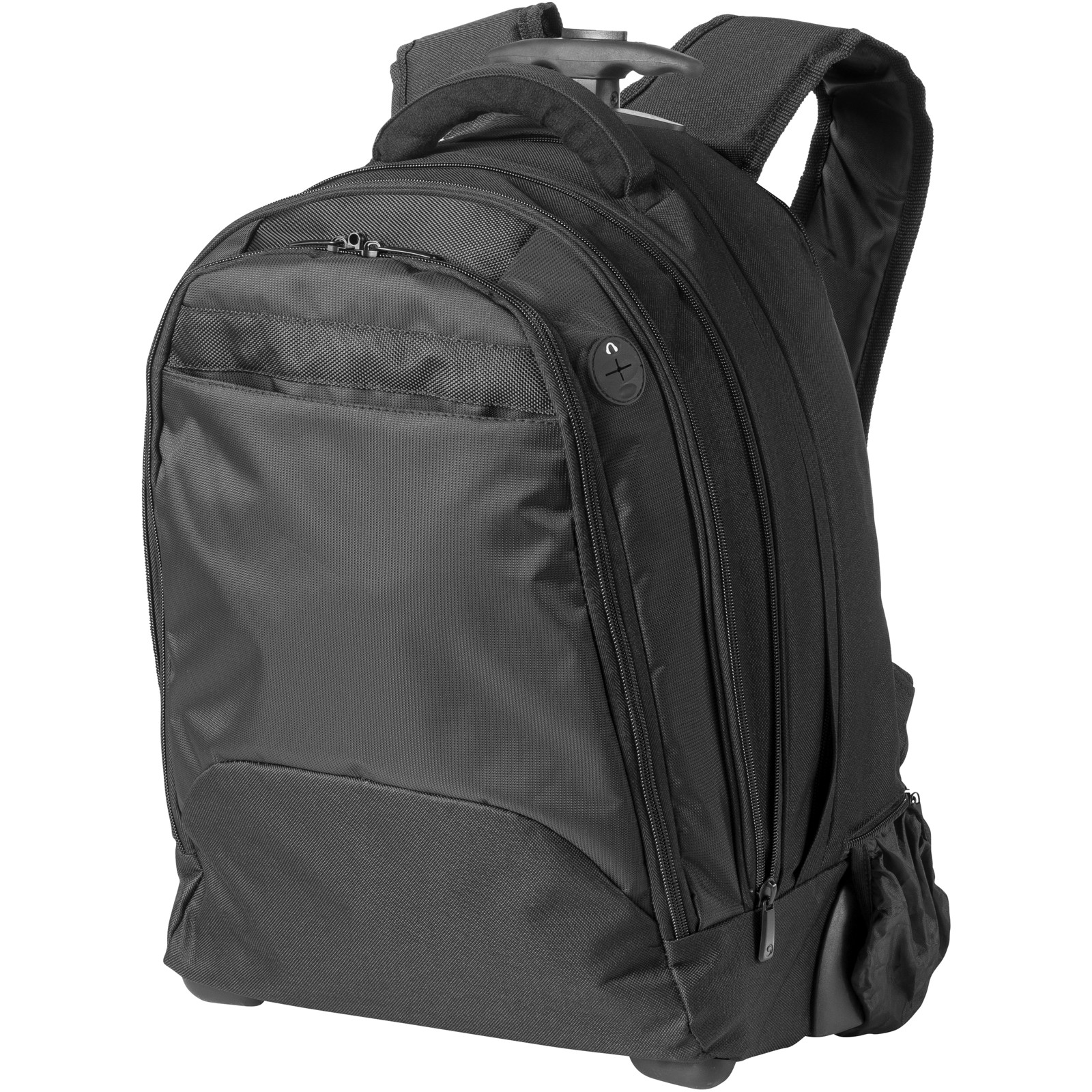 Lyns 17" laptop trolley backpack. Main compartment with file dividers and laptop pouch which fits most 17" laptops. Front pocket with organizer and media pocket with headphone port. Telescoping handle and inline wheels with removable covers for smooth rolling. Hideaway backpack straps and ultra comfort carry handle. . 840D Nylon.