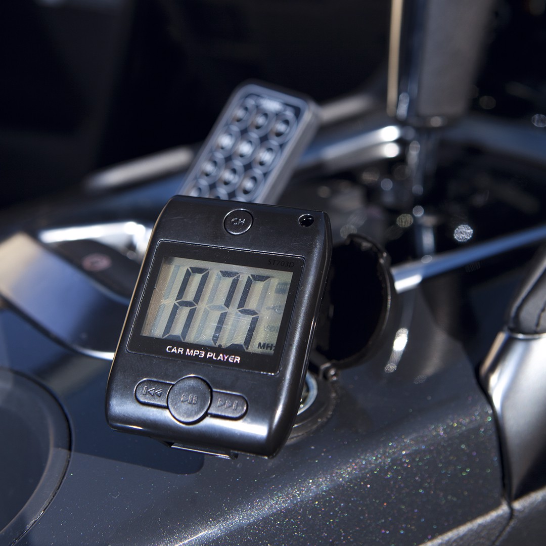 MP3 music player for car lighter. Connection to the car radio via FM frequency. Built-in LCD display, SD card slot and USB data sync. With multi-function remote control and telescopic adjustment system. Presented in an attractive design box.