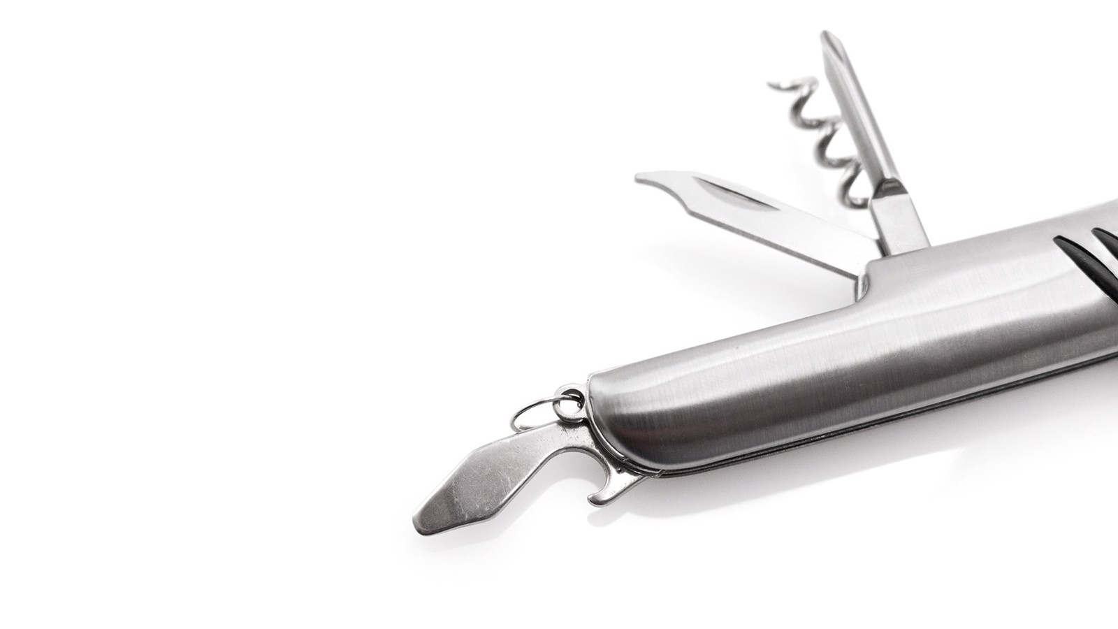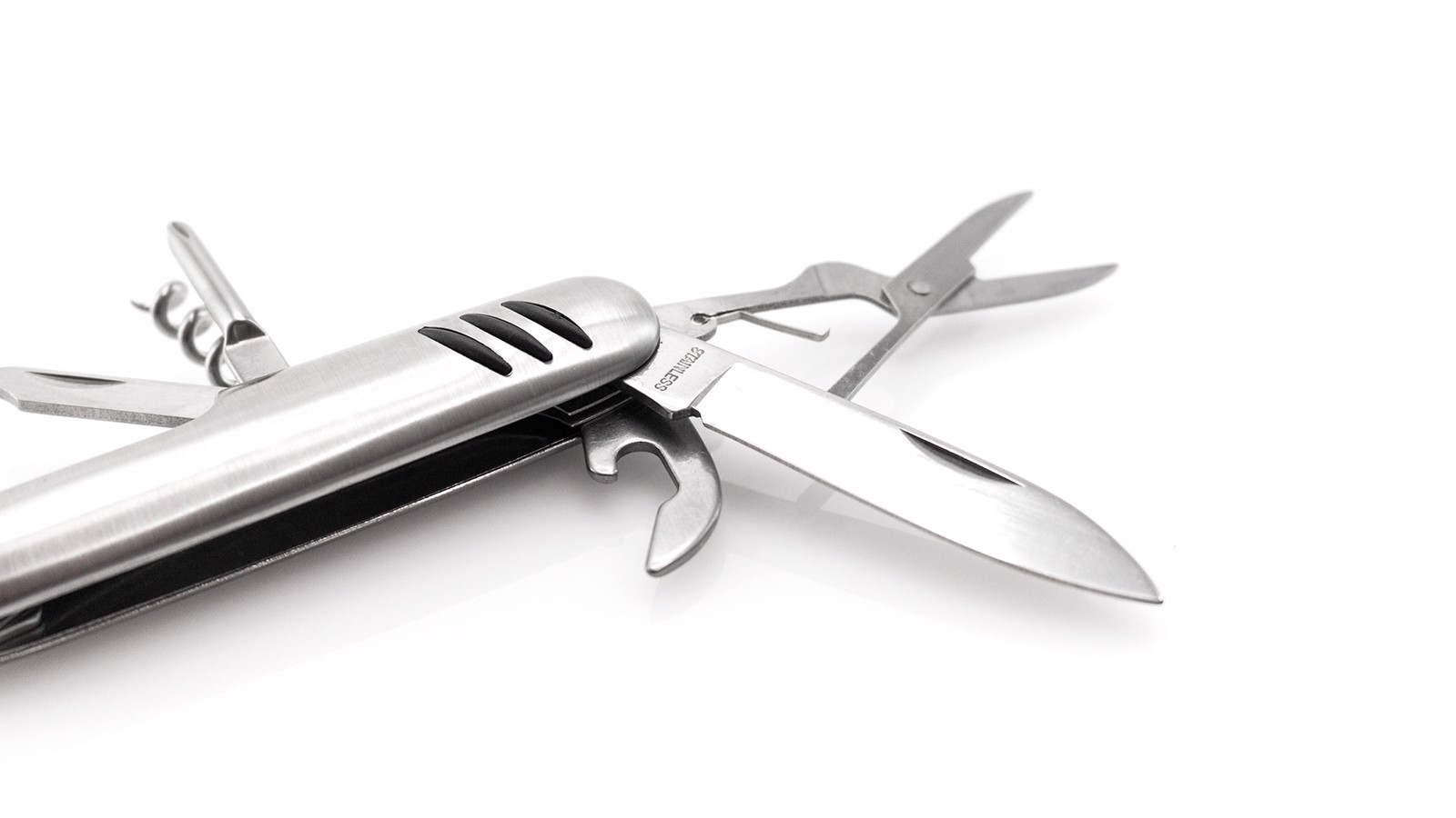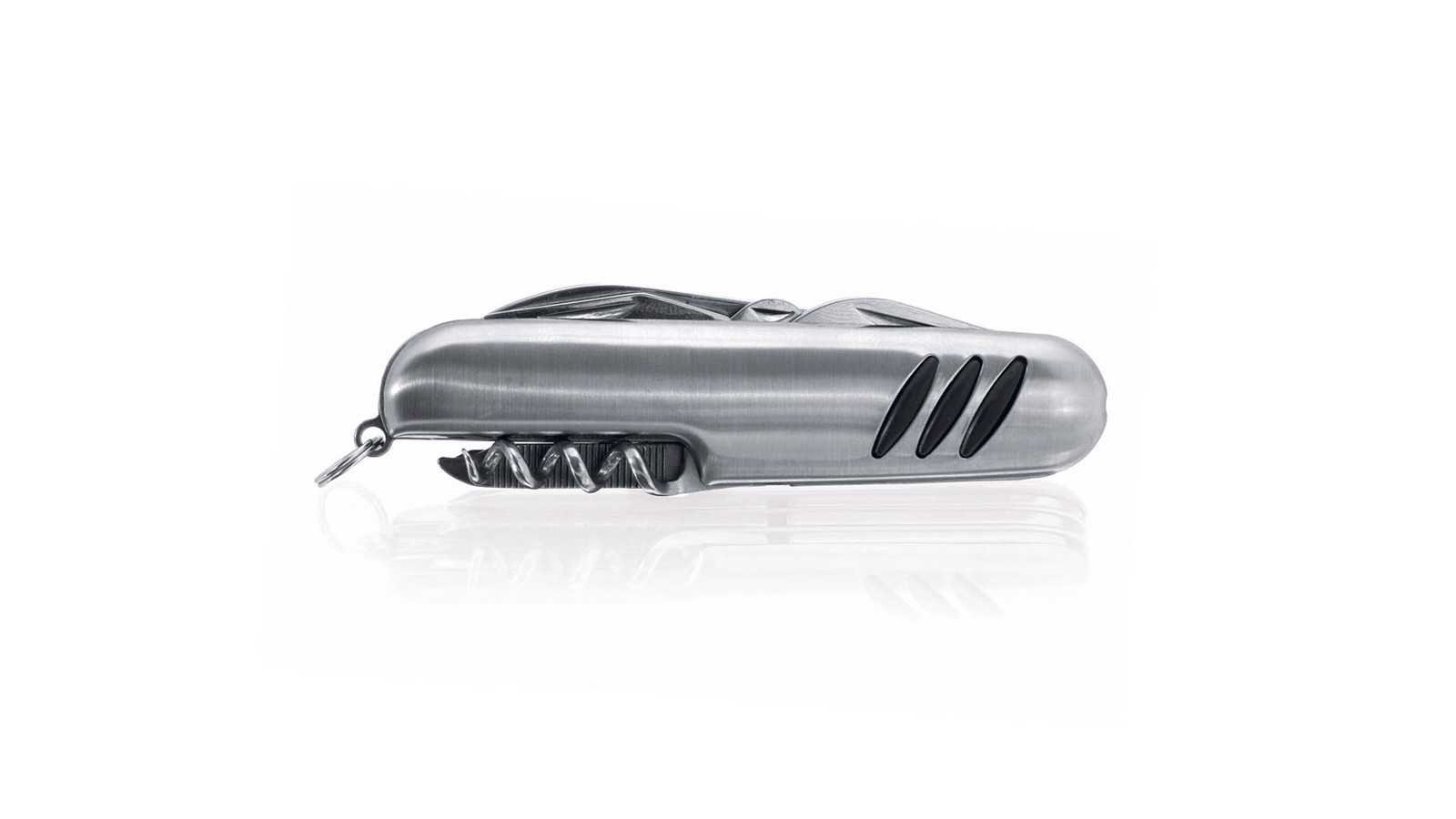 Multi purpose 10-function stainless steel knife with non-slip handle. Includes knife, openers, screwdriver, file, scissors and keychain. Presented in an individual box. 10 Functions