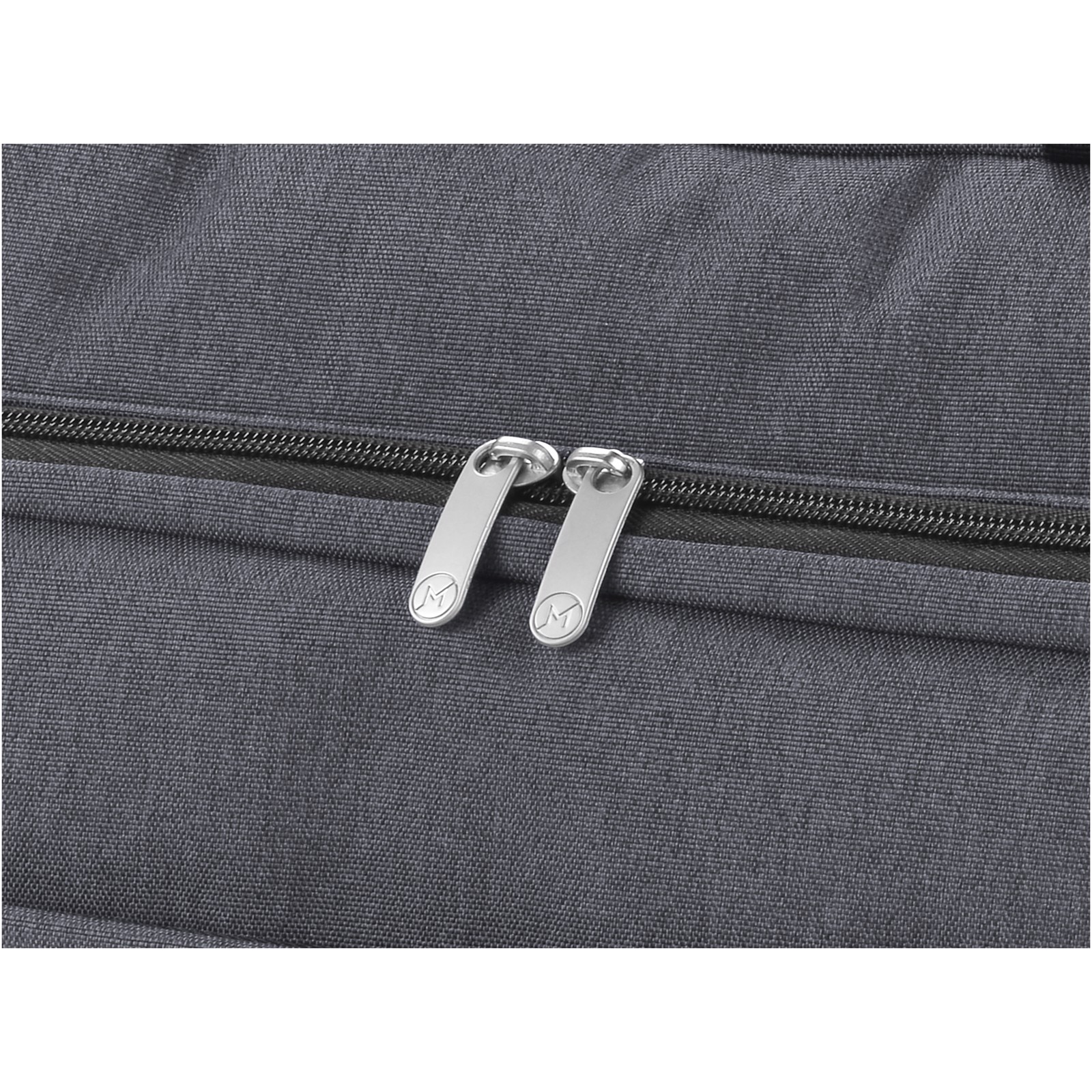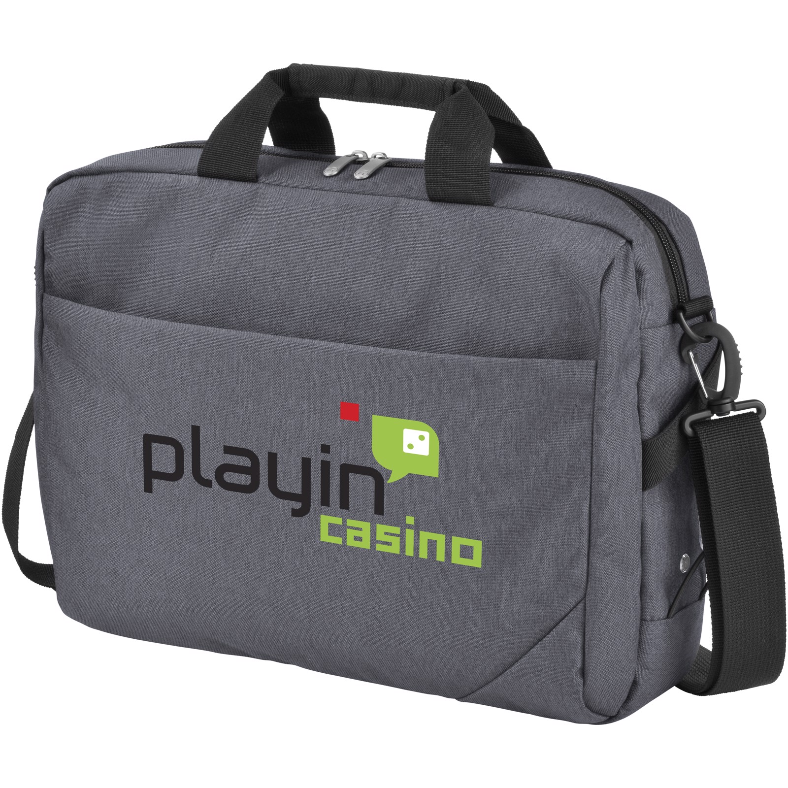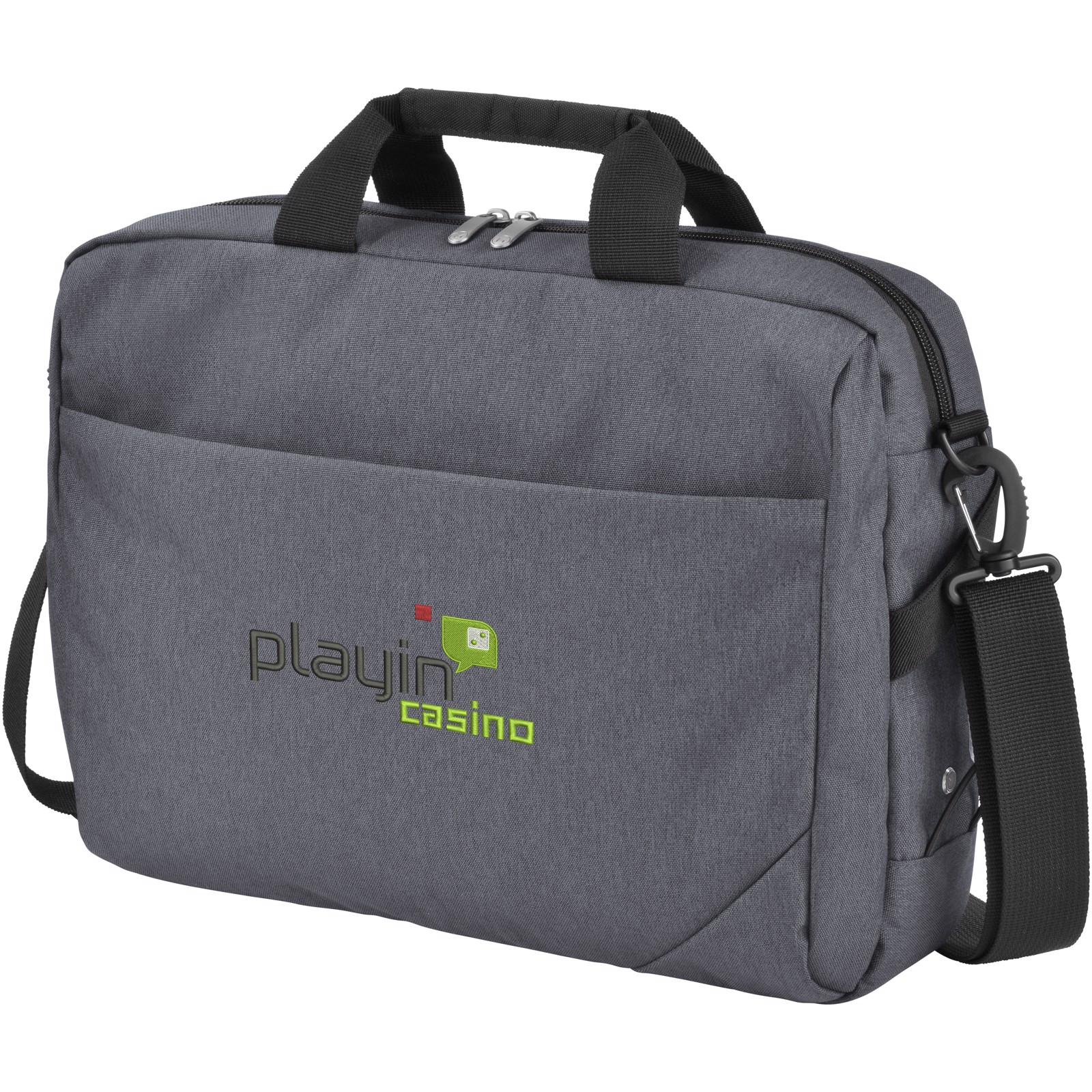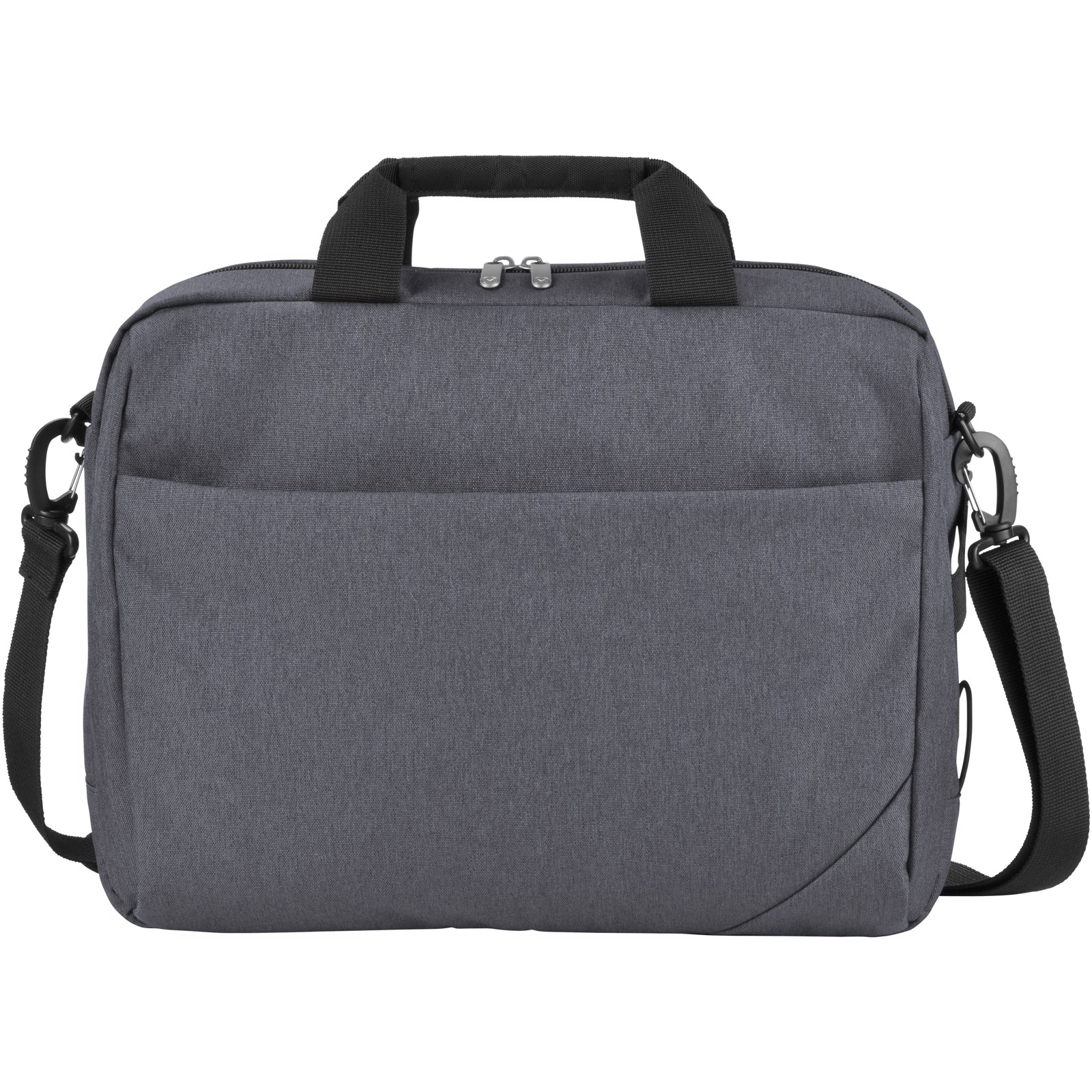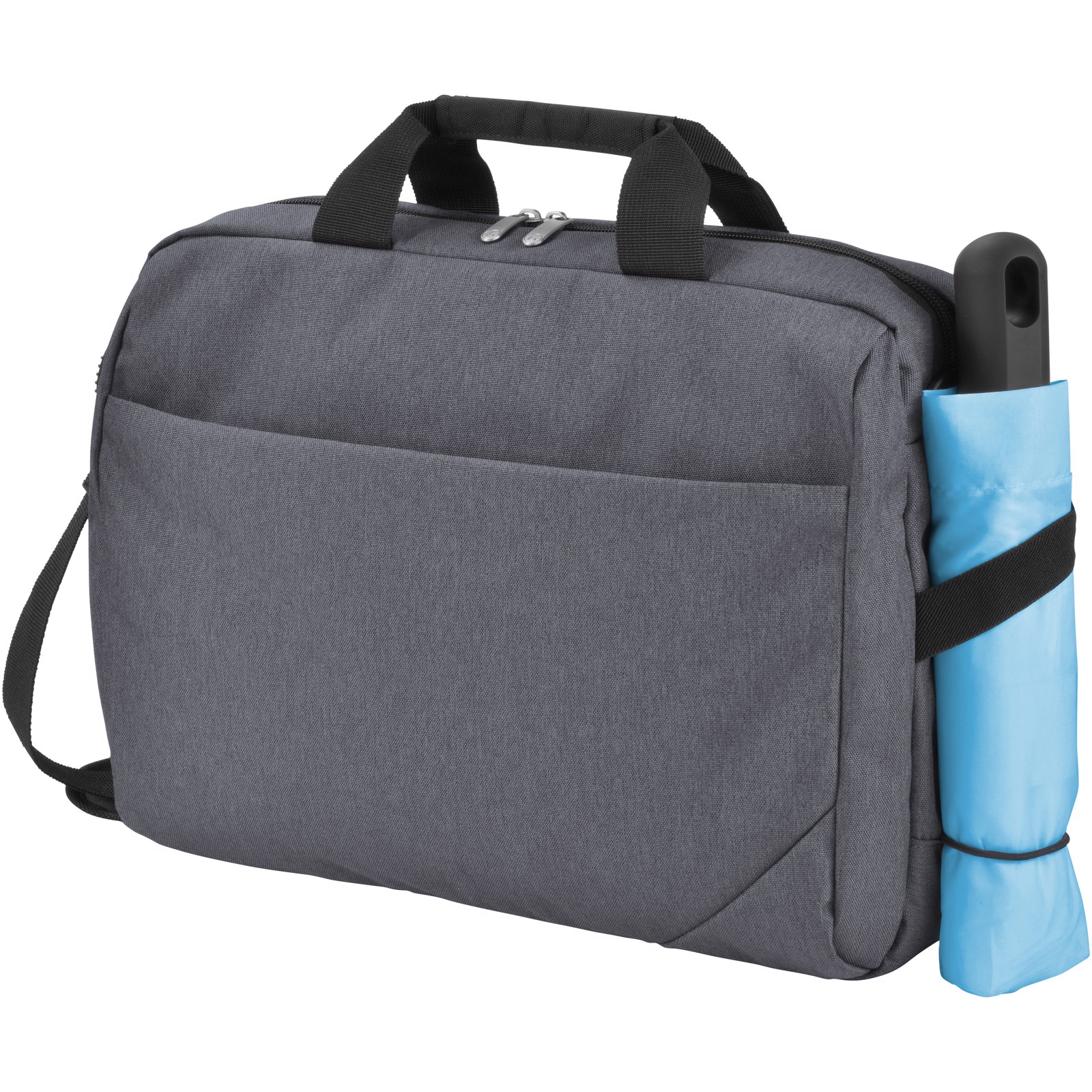 Exclusive design laptop bag with zippered front pocket, zippered main compartment with 14" laptop compartment and tablet compartment. Removable and adjustable shoulder strap. Carry handles. Trolley tunnel on backside. Elastic tunnel and loop on the side at the bottom can be used to secure your section umbrella or water bottle.