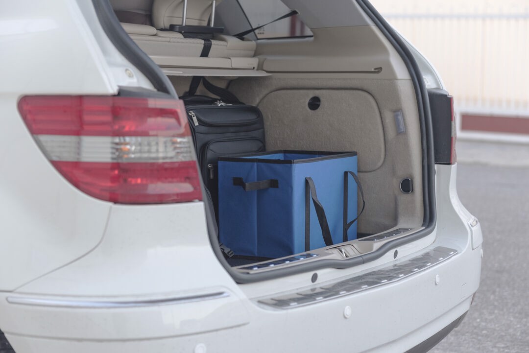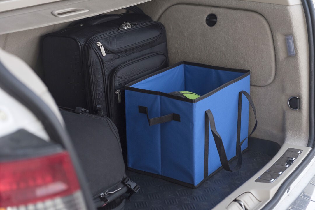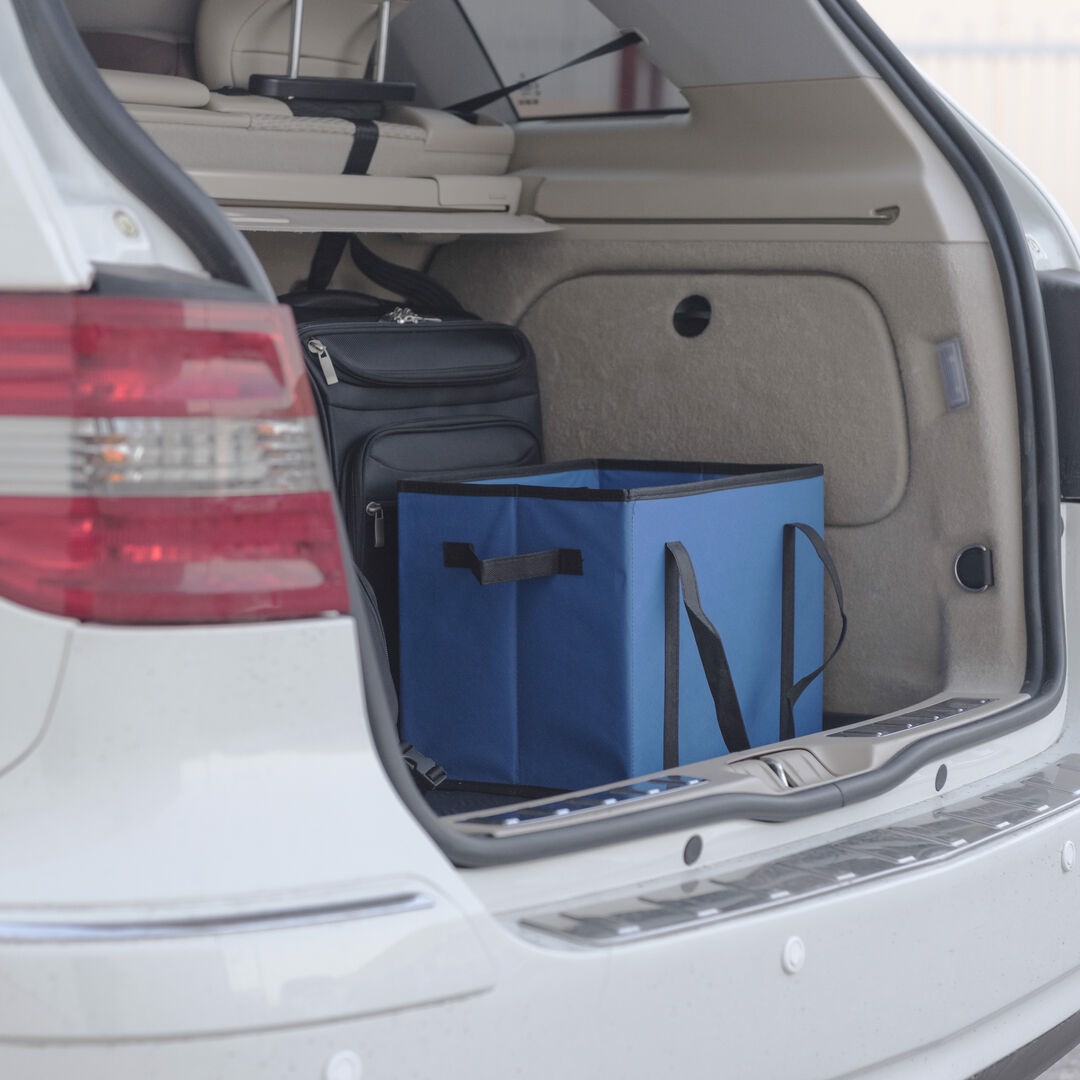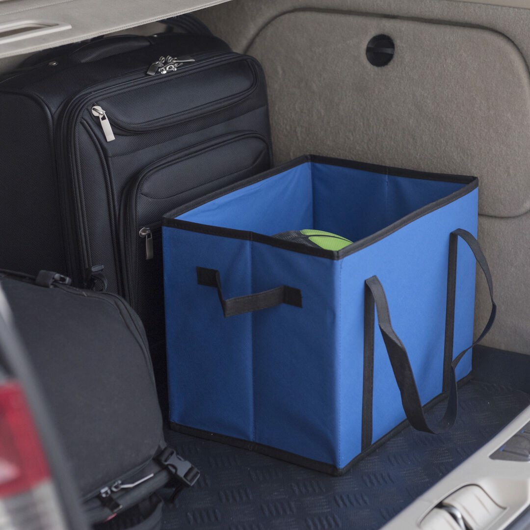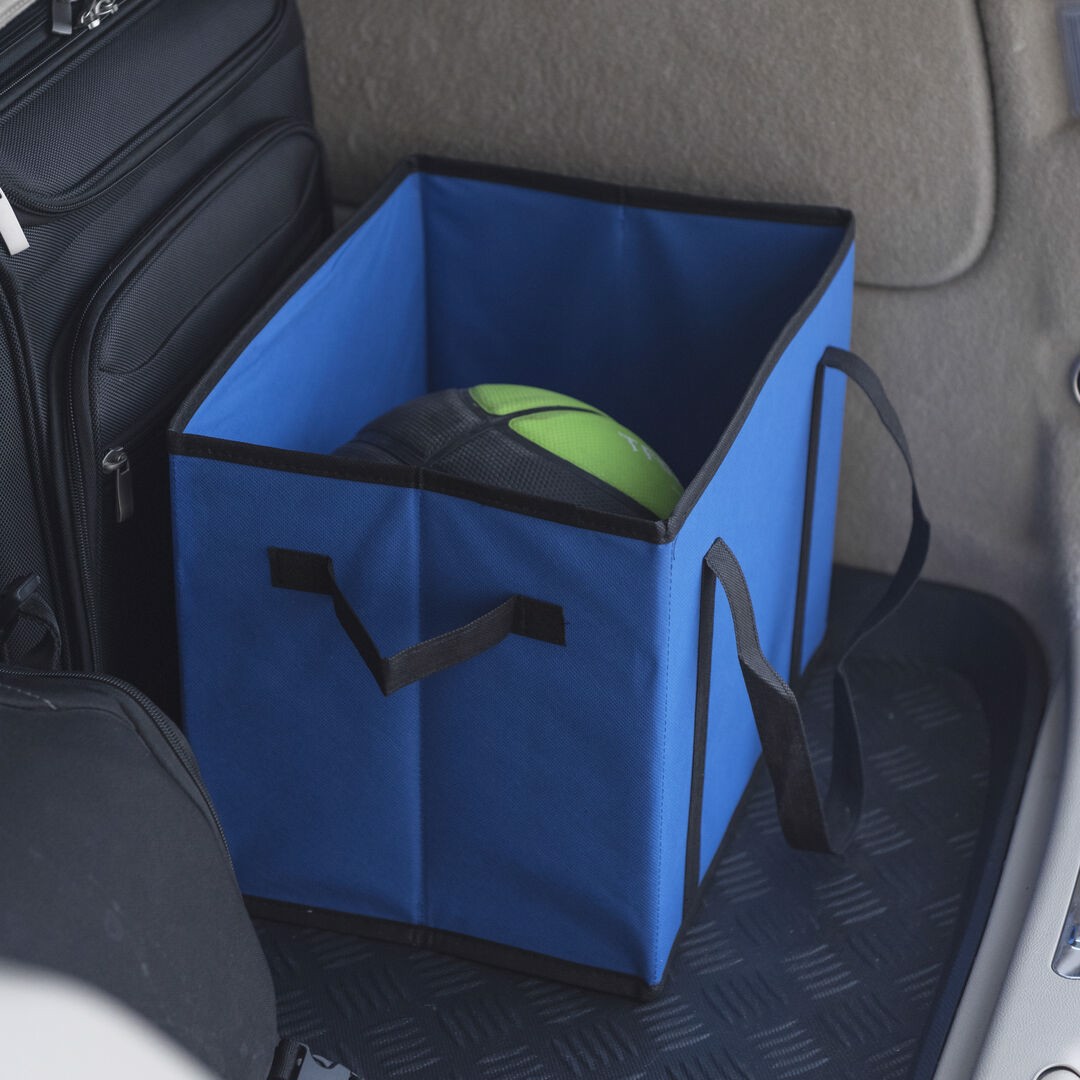 Folding organizer for the boot of the car in resistant, brightly colored non-woven. With reinforced carrying handles, side handle, front pocket and a rigid base for a firm fitting.