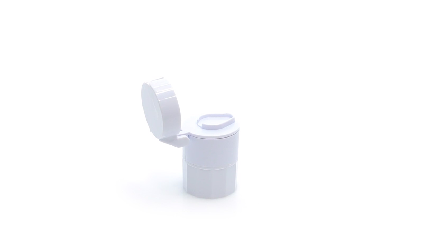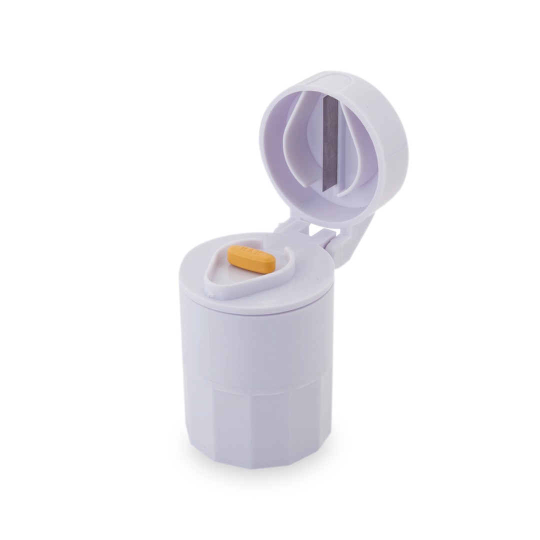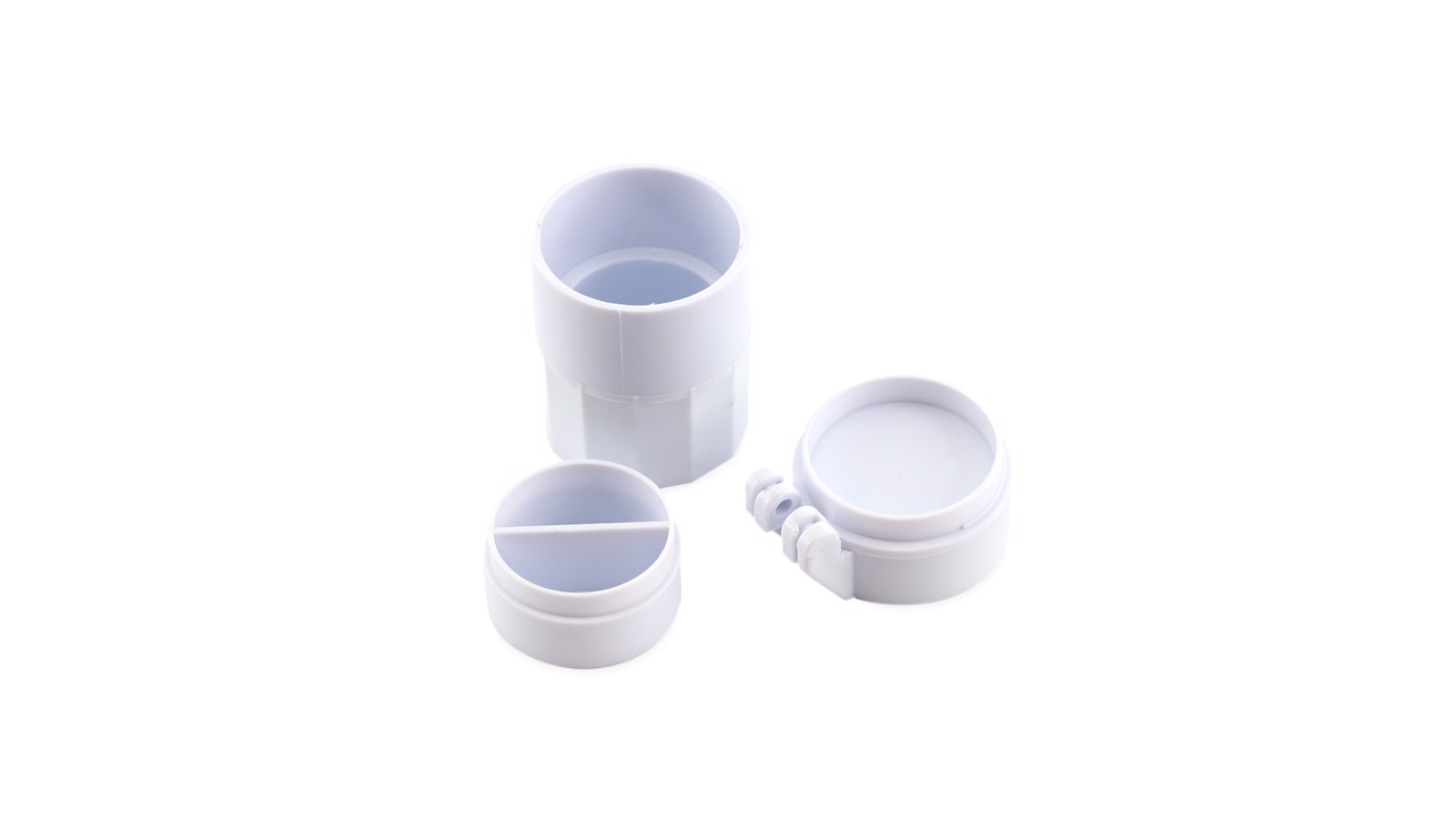 Pill box in soft and resistant material in white. With 2 inside tanks, crusher with screw-on mechanism and cutter for splitting tablets. 3 Compartments