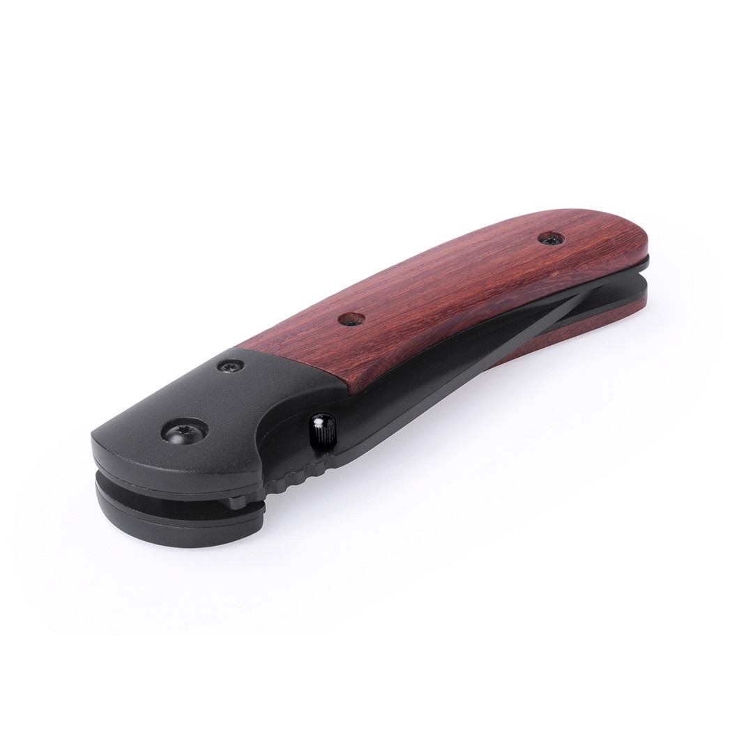 High quality knife with black stainless steel blade and natural wood handle with safety lock. Presented in an individual box. Safety Lock Included