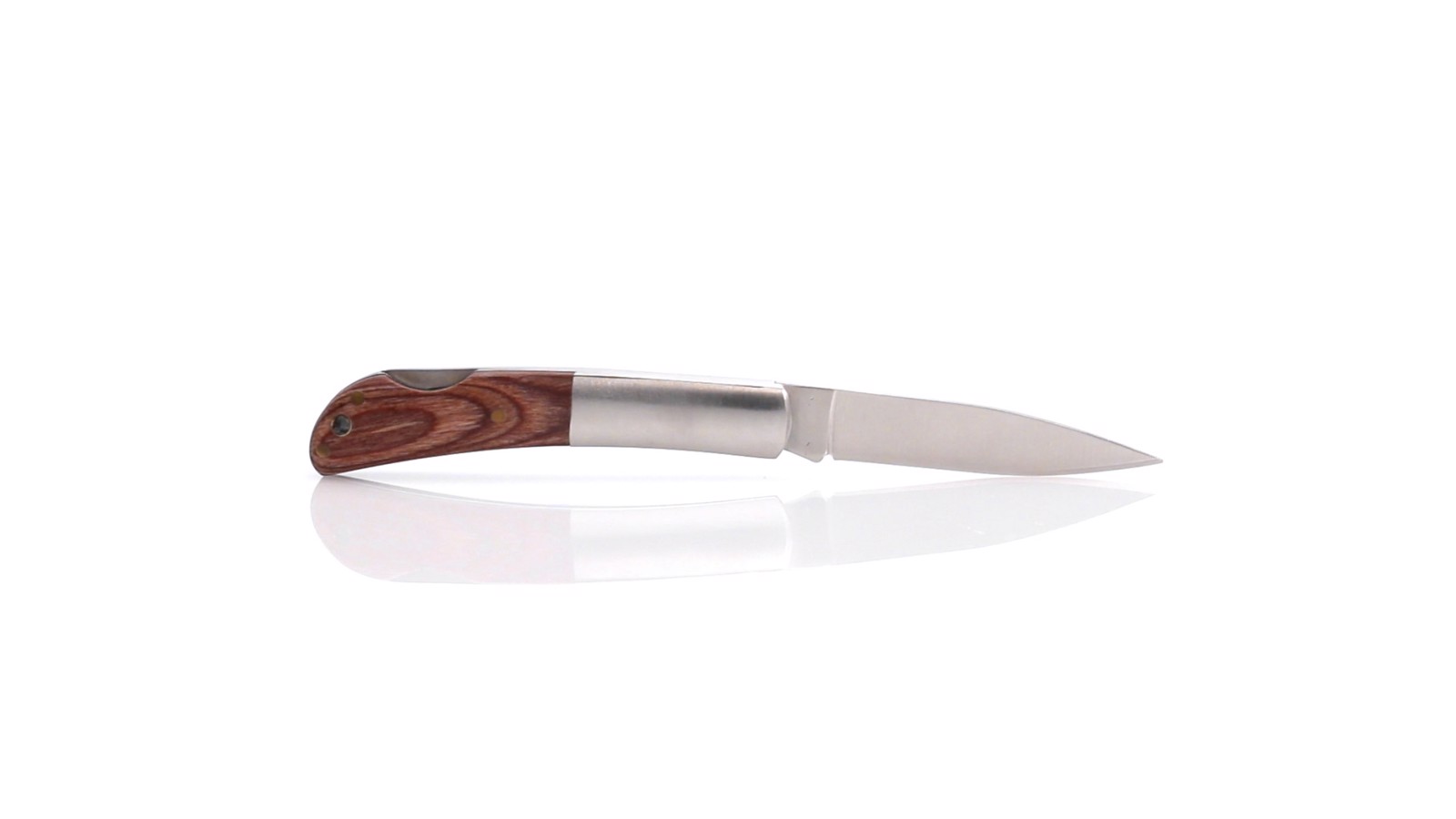 Knife with stainless steel blade and handle in combination with natural wood and stainless steel. With safety lock, die-cut on handle and presented in an individual box. Safety Lock Included