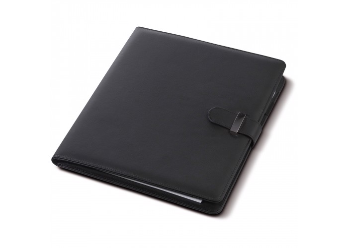PU A4 portfolio with metal part which is suitable for laser engraving. Inside pocket for your tablet and storage of papers. A4 notepad included (50 sheets) and pen loop. Gift box included.