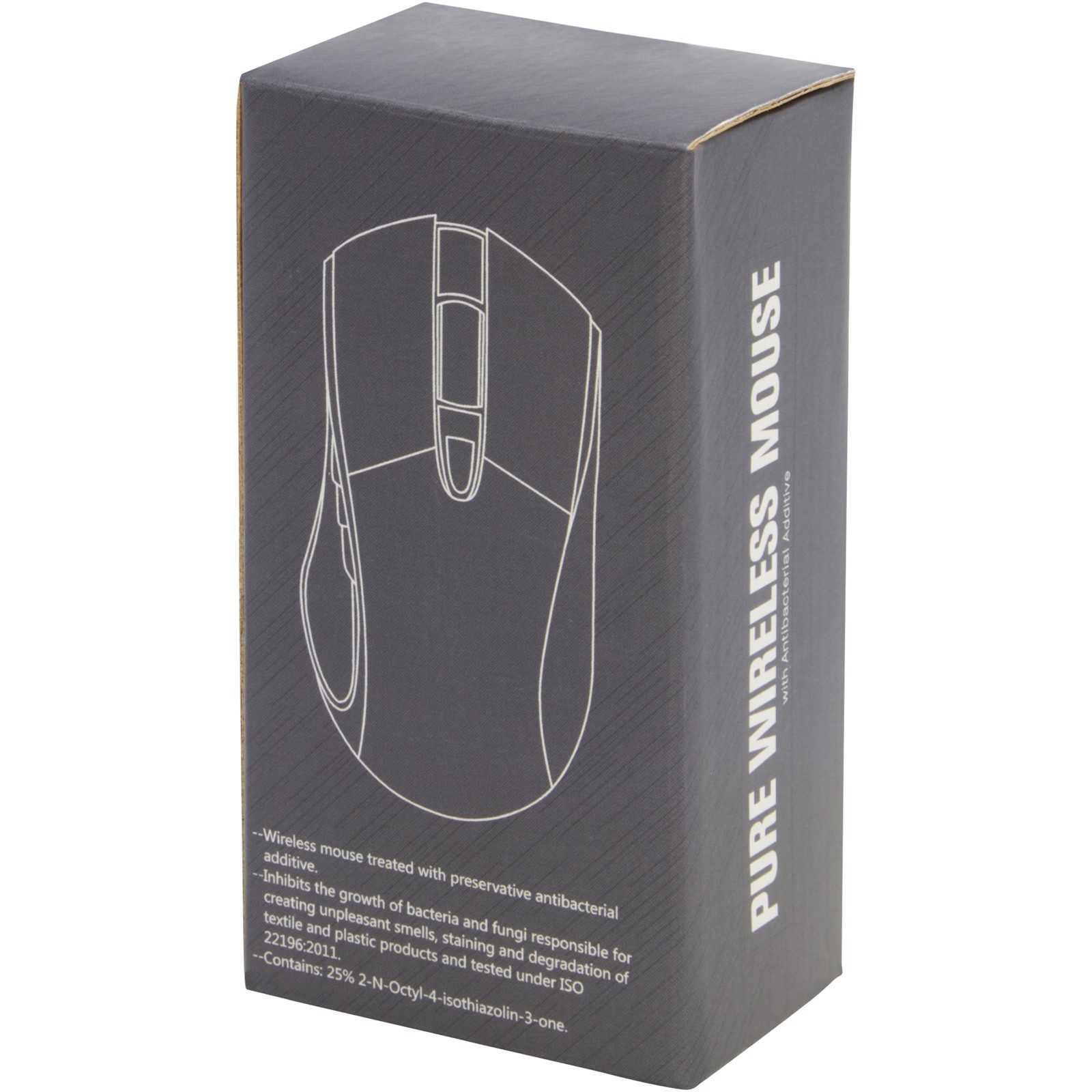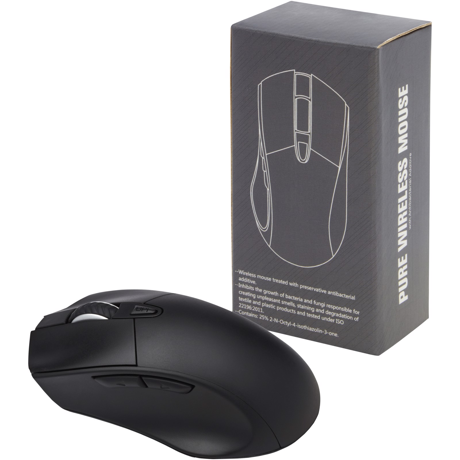 Antibacterial wireless optical mouse with ergonomic design, with a DPI button (800/1200/1600) for adjusting the precision of the pointer. Antibacterial additive with high effectiveness in inhibiting the growth of bacteria and fungi. Tested according to ISO 22196:2011. Powered by 2xAA batteries (not included). Delivered in a premium gift box.