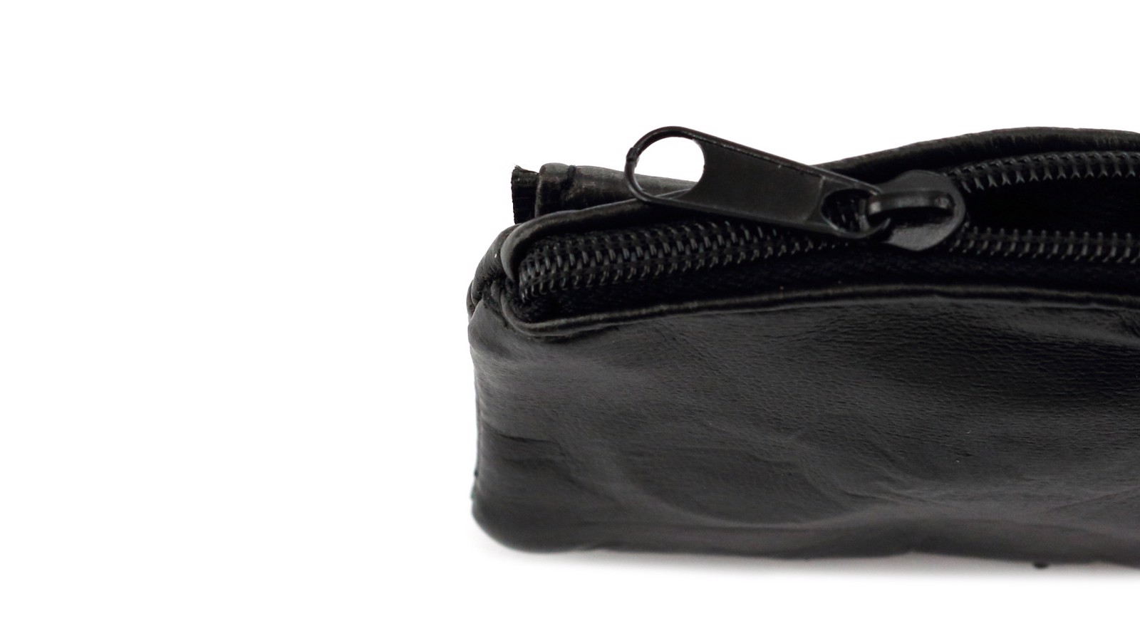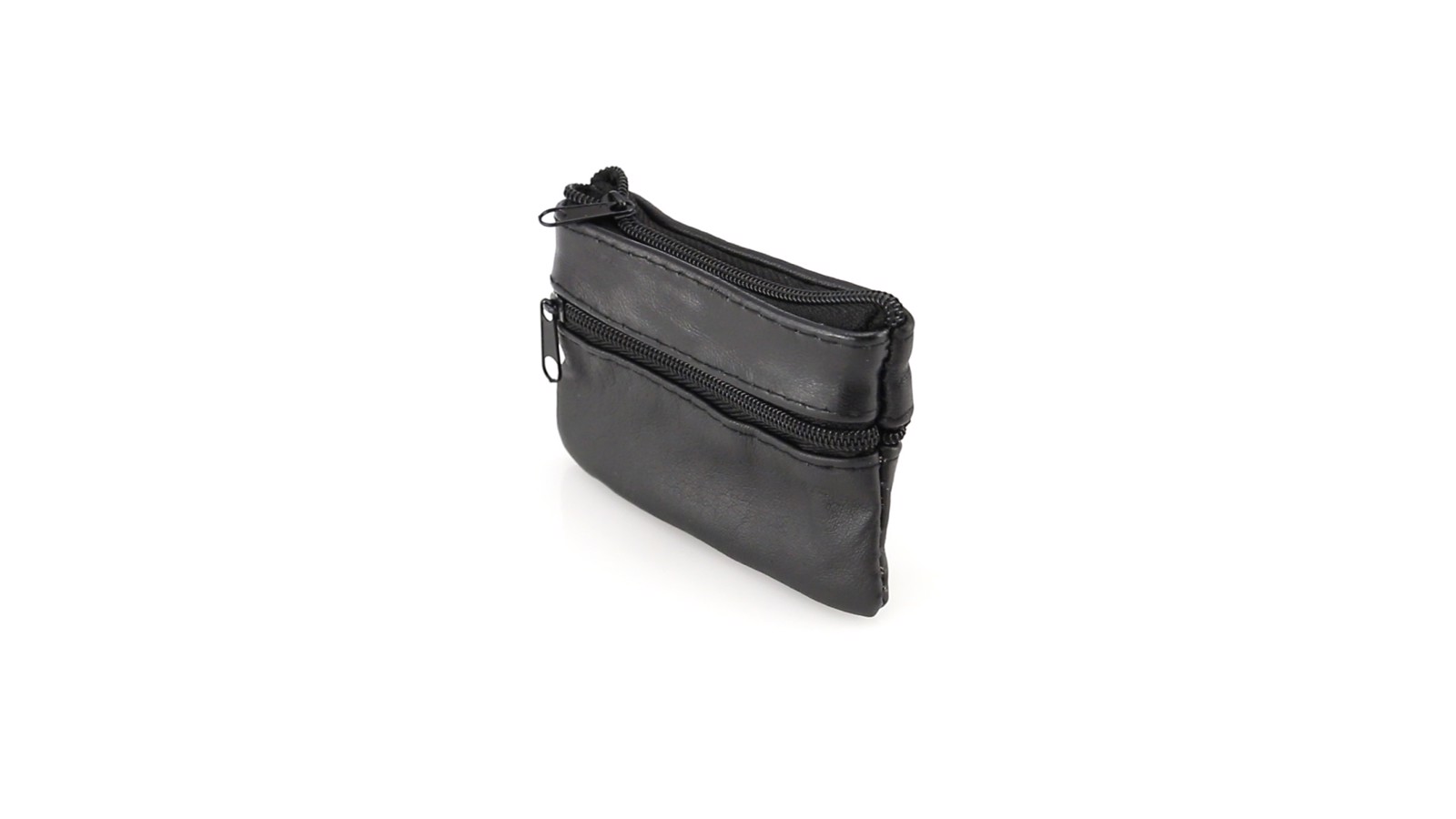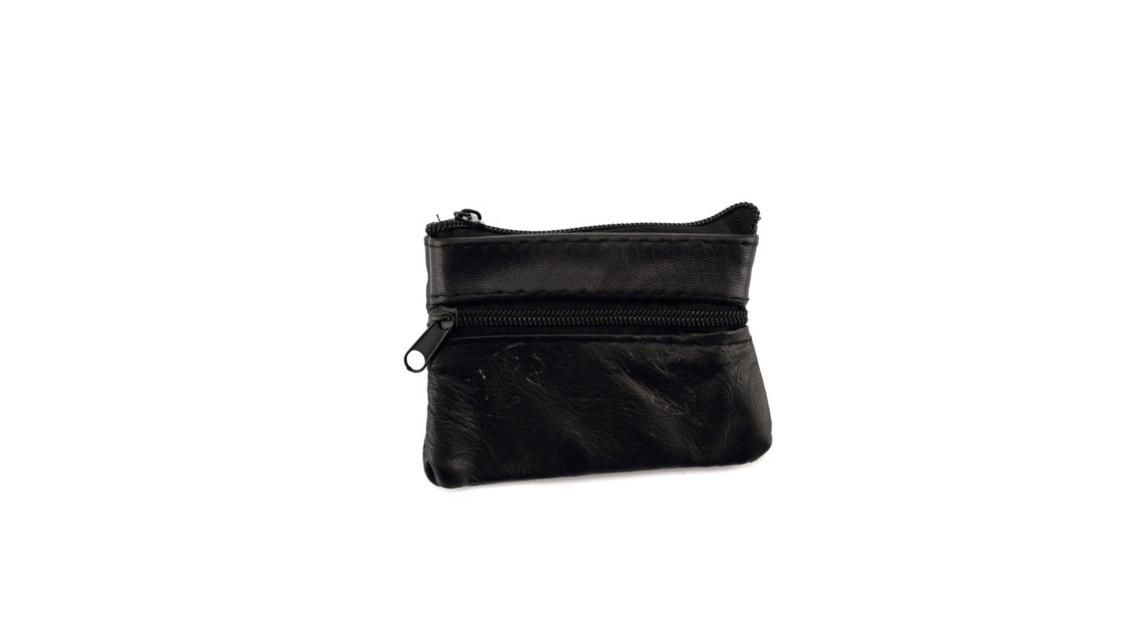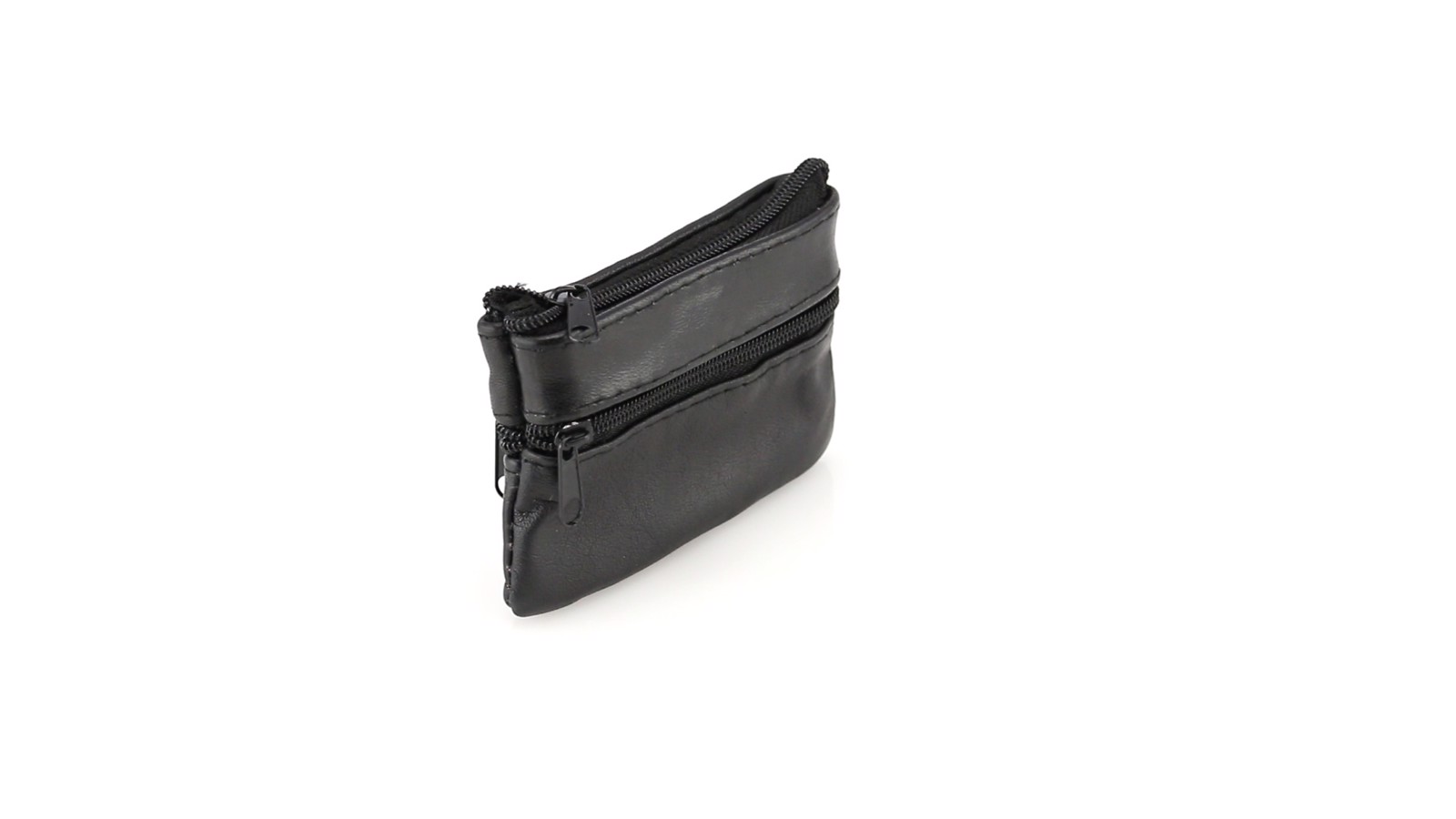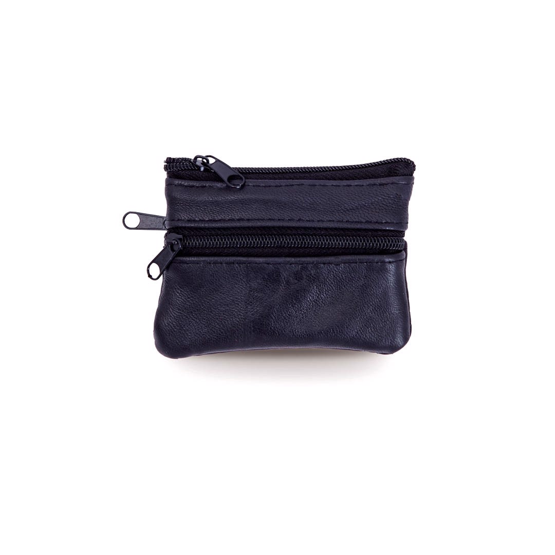 Coin purse of classic design with soft body in glossy black PU leather. Main compartment, front and back pockets with matching color zipper closure. Inside lined with keychain.