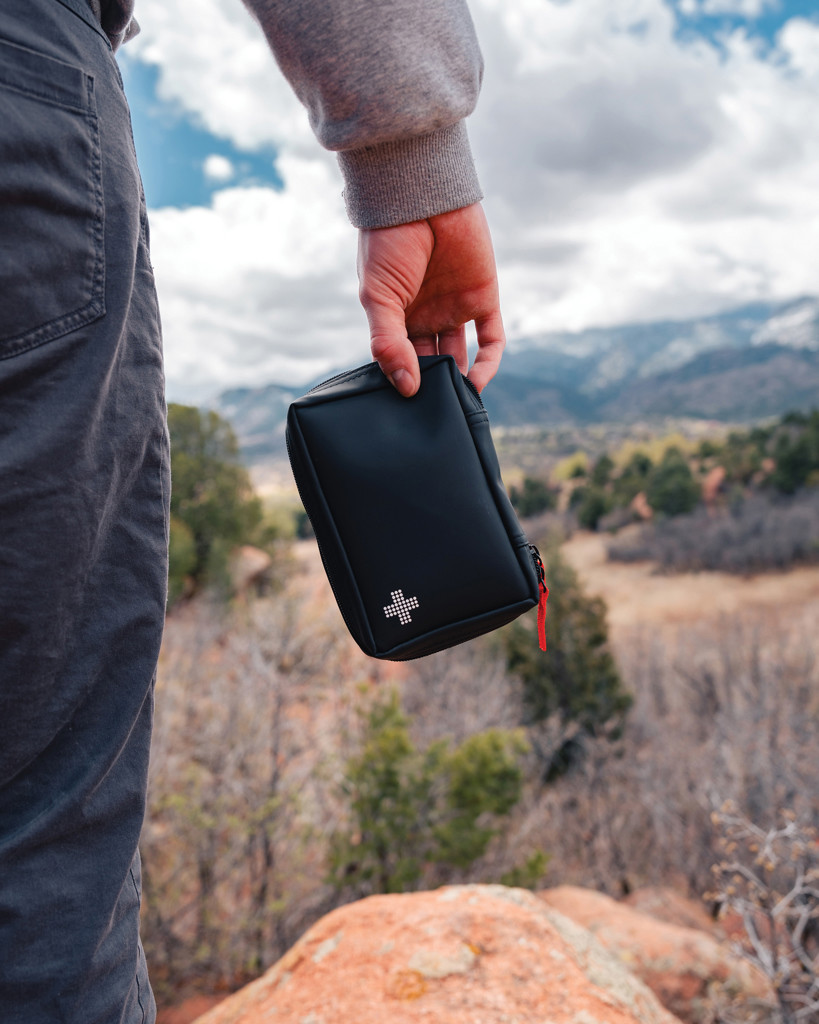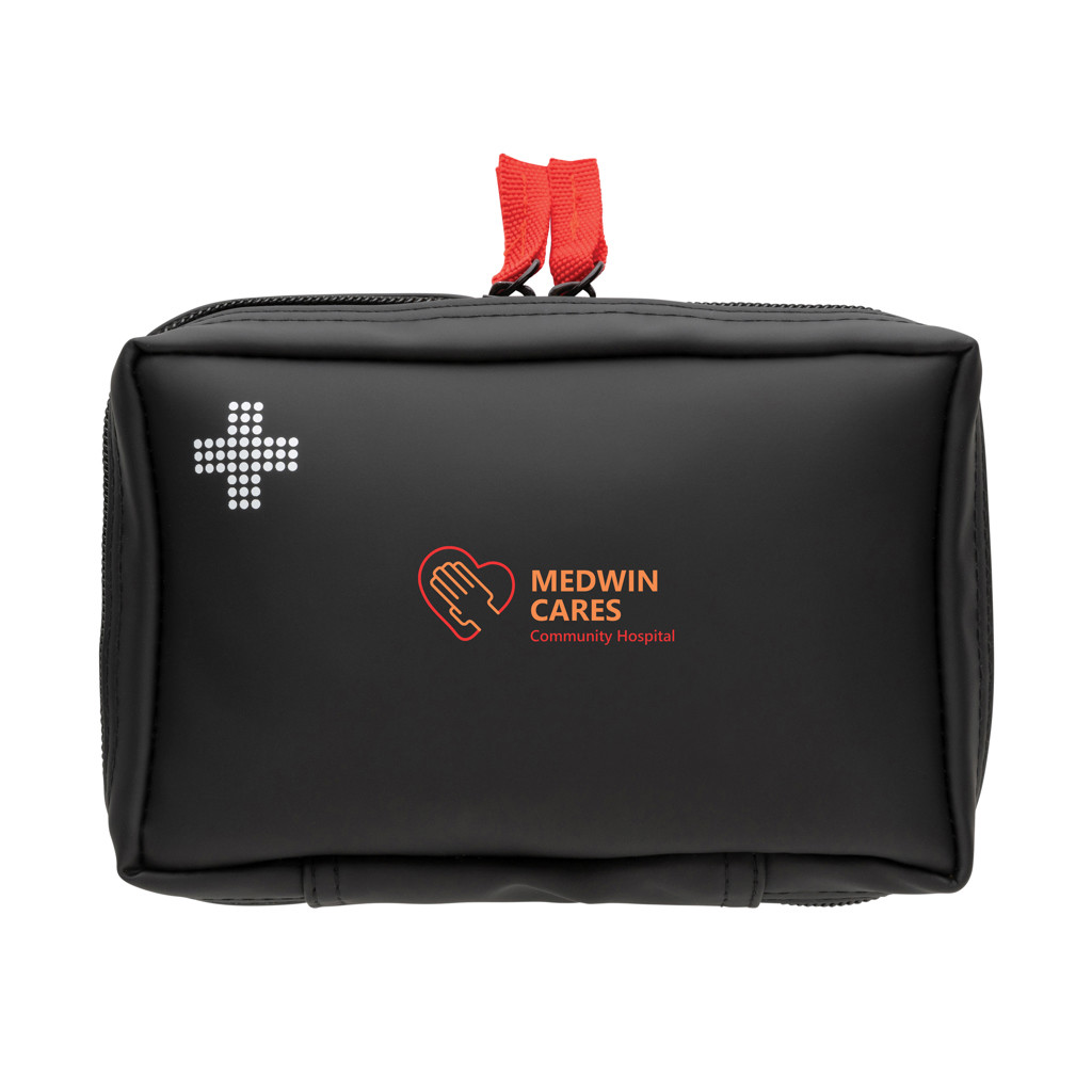 Luxury first aid kit, featuring a water-repellent nubuck-PU material that is both stylish and practical. The material is easy to clean and repels water, making it perfect for use while on the go 1pc PBT bandage, 1pc PBT and compress bandage, 1pc triangle bandage, 1pc safe kiss, 1 pair of gloves, 1pc tape, 3pcs pin, 1pc scissor, 10pcs plasters and 4pcs alcohol pads; ; All content according to Medical Device Directives: 93/42/EEC and EU (2017/745), EN ISO 13485:2016; All content (except for pins and scissor) packed in paper bag marked with all mandatory markings needed for EU, like “Expiration date, CE, LOT number. Total recycled content: 24 % based on total item weight. RCS certification ensures a completely certified supply chain of the recycled materials