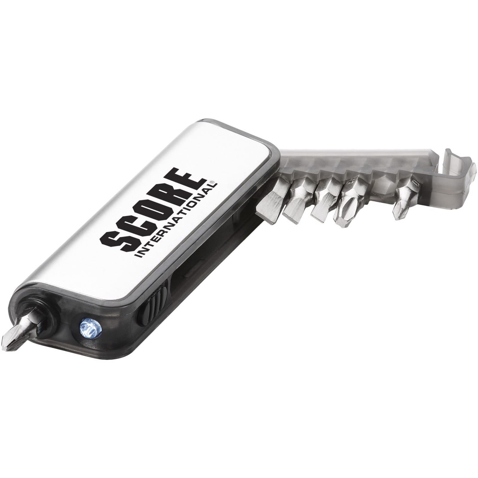 Includes three flat head and three head bits. Magnetized screwdriver head secures bits in place. LED flashlight. Battery included.