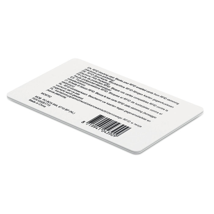 RFID blocking card. The aluminium layer inside this card blocks all radio frequencies passing through. All other cards behind this blocking card will be protected from being skimmed. (0,76 mm).