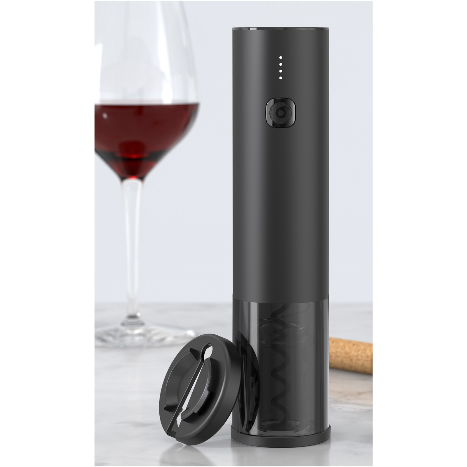 Electric corkscrew (18.8 x 4.4 cm) allowing you to open a bottle of wine in approximately 8 seconds without any effort. The top of the corkscrew can be personalized with a light-up logo. It is equipped with a 500 mAh integrated battery that is rechargeable via a USB-C connector. The corkscrew can open up to 50 bottles on a single charge. A blue LED light indicates when it is switched on. The base provides good stability to the device and also serves as a foil cutter. Packed in recycled kraft paper box (20 x 7.2 x 5.8 cm). Includes 3 year warranty.