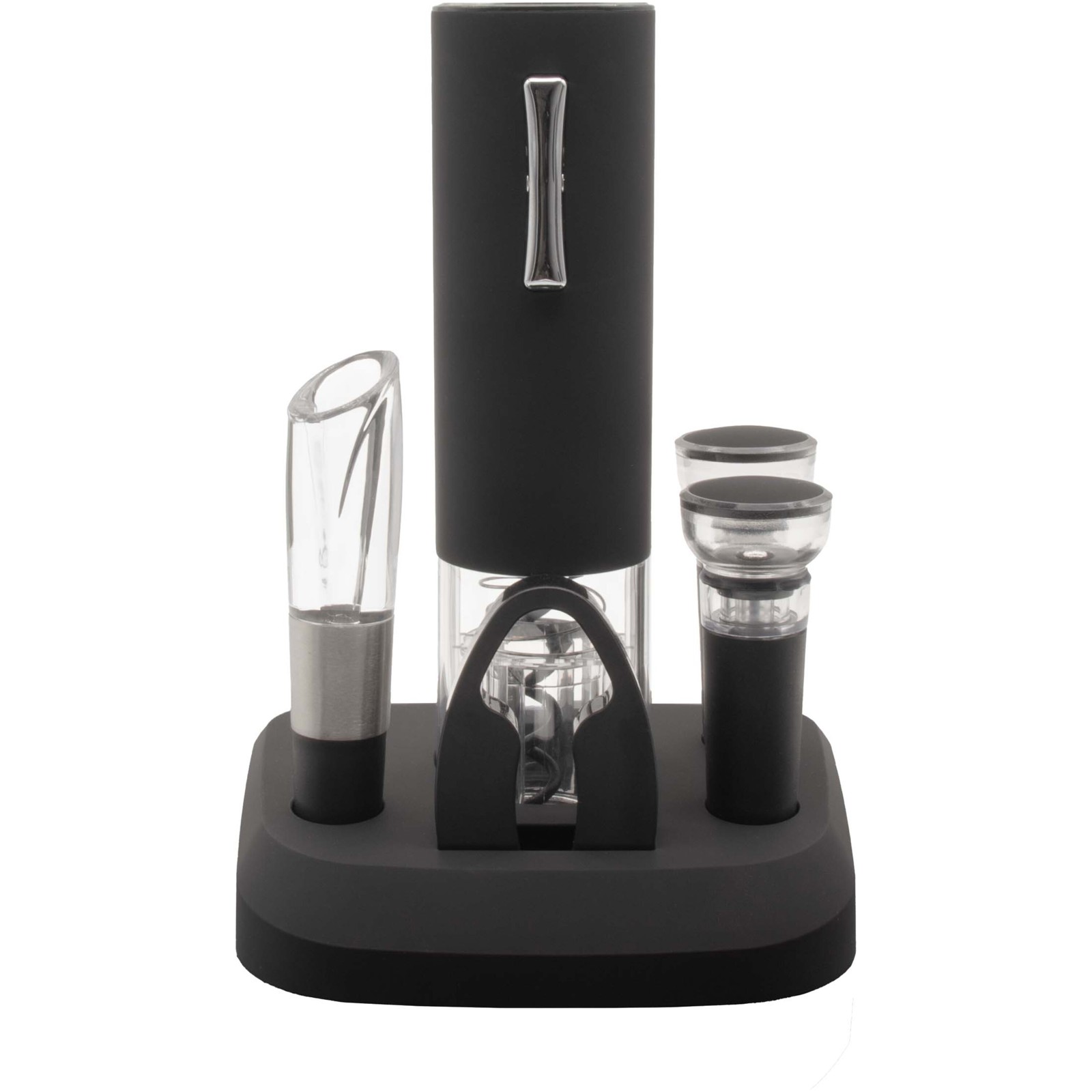 Enjoy a perfect blend of wine and technology with this all-in-one electric wine set. The included foil cutter fits neatly over the bottle neck for a clean, effortless cut. The fully automatic corkscrew removes the cork in seconds and stops automatically once extraction is complete, while a second button gently releases the cork. The set also features a pourer with a built-in aerator to enhance the wine’s flavour as you serve. To preserve your wine, use the vacuum stopper to remove air and maintain freshness – simply insert it firmly into the bottle and pump until resistance is felt. Before first use, fully charge the base for 12 hours. Can be customised with laser engraving with a metallic effect. Delivered in a recycled cardboard gift box.