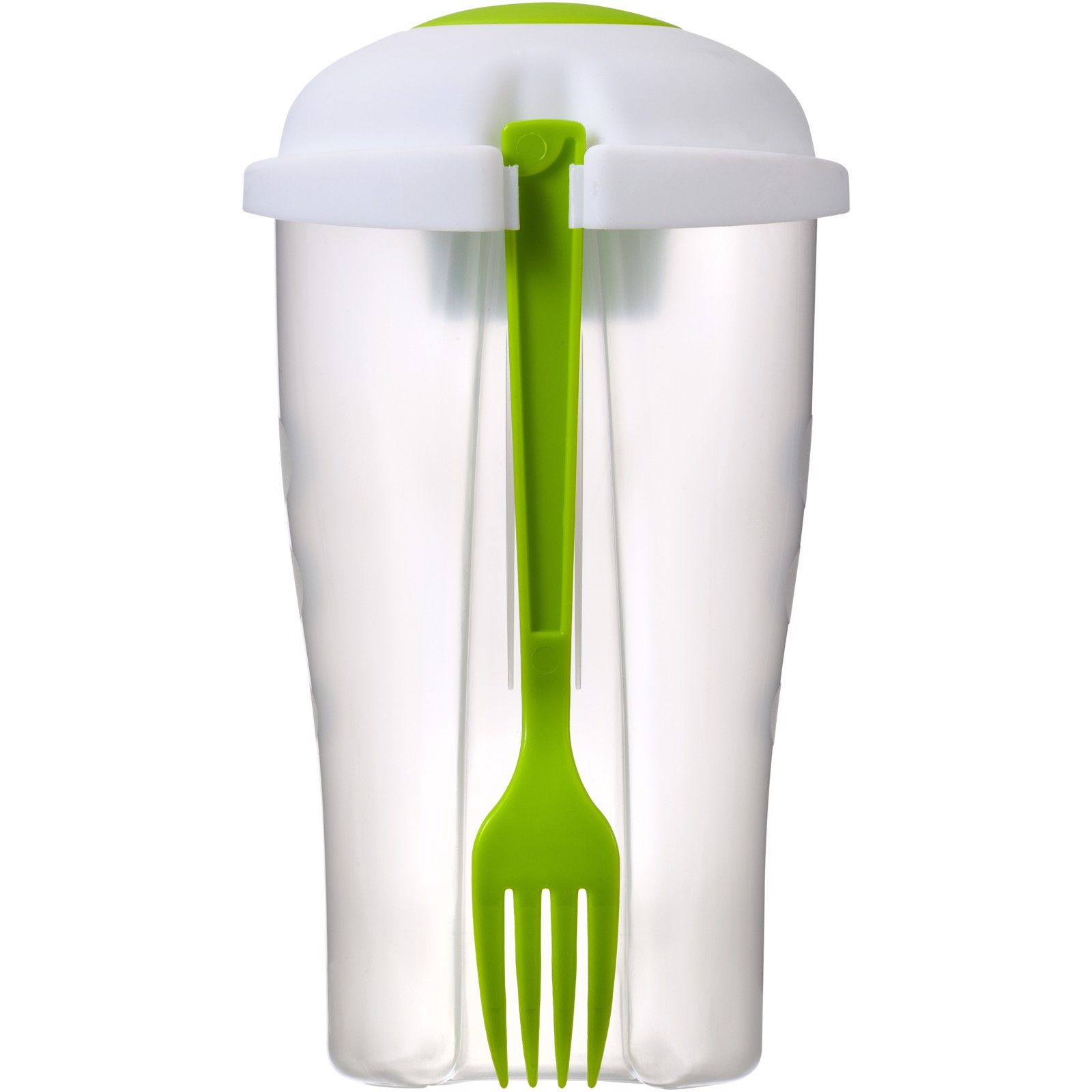 Shakey salad container set. Convenient storage for salads on-the-go. Includes fork and removable container, suitable for dressings and toppings. PP Plastic.